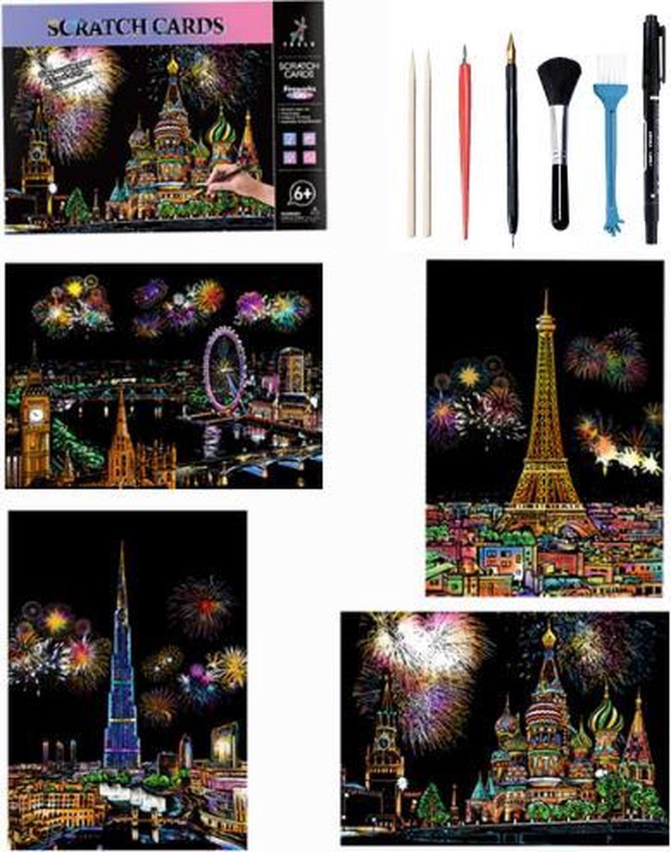 ?? Gratis verzending! De meest complete scratch art set aller tijden ! Deze set bevat niet alleen 4 prachtige kraskunstwerken in thema, maar óók een uitgebreide 7-in-1 gereedschappen set in handige hersluitbare verpakking. Onze sets garanderen urenlang plezier voor jong en oud, ervaren en onervaren, met als resultaat prachtig kleurrijke kunstwerken om in te lijsten, op te hangen of cadeau te geven. Hoe werkt scratch art? Heel eenvoudig! Kras met de bijgeleverde gereedschappen zo zorgvuldig alle grijze vlakken in de afbeeldingen weg om een prachtig kleurrijk kunstwerk zichtbaar te krijgen. Urenlang plezier gegarandeerd voor bijna iedereen met de leeftijd 9-99 jaar. Deze set in het thema "Vuurwerk" bevat het volgende: - 4 prachtige A4 thema krastekeningen - 7 stuks kras gereedschap in handige hersluitbare verpakking