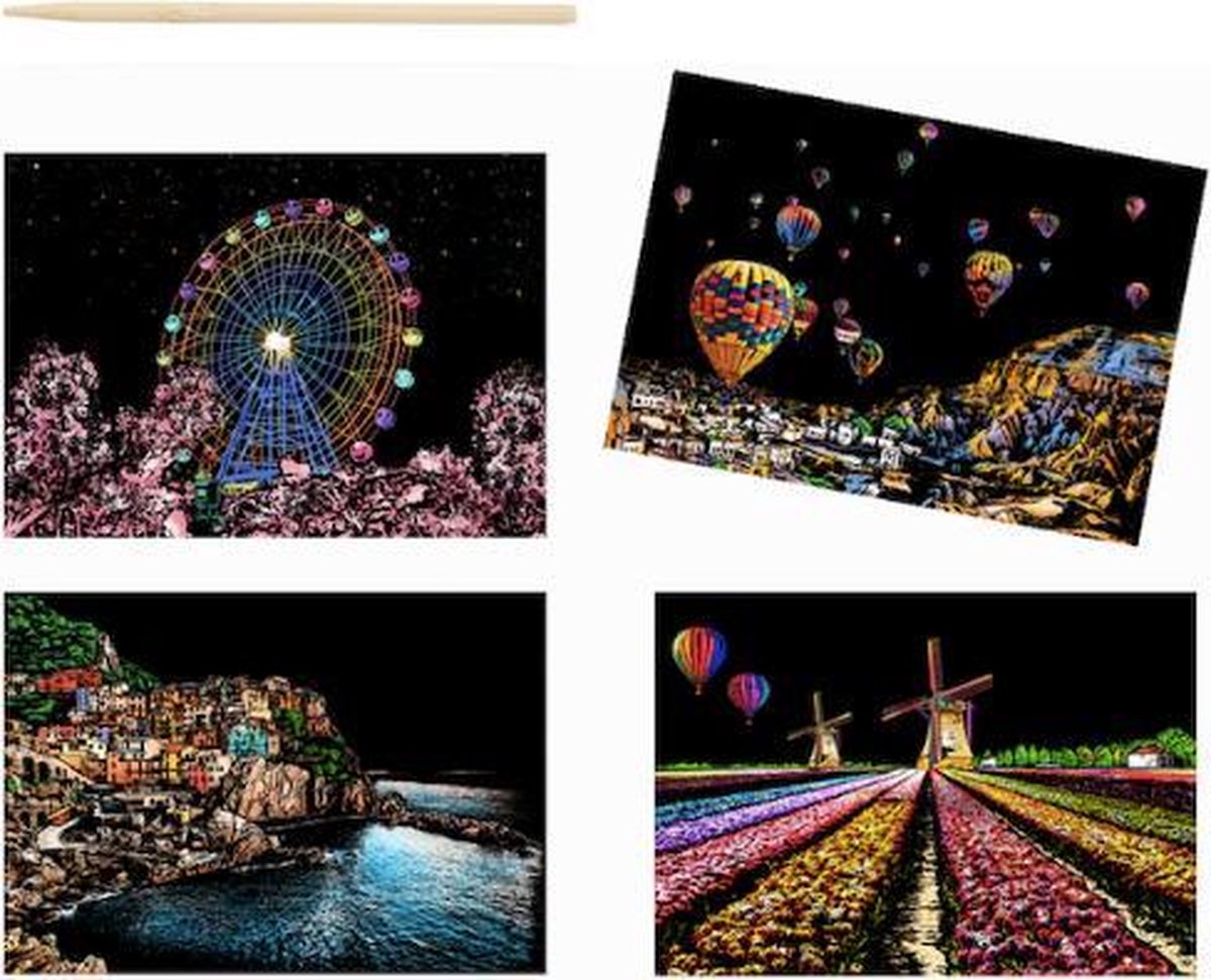 Met deze 9-in-1 Scratch Art A4 formaat set maak jij je eigen kunstwerken. Onze sets garanderen urenlang plezier voor jong en oud, ervaren en onervaren, met als resultaat prachtig kleurrijke kunstwerken om in te lijsten, op te hangen of cadeau te geven. Deze set bevat krasplaten in de style "Europa" Wat ontvang je? - 4 prachtige A4 formaat thema krastekeningen - 1 stuks gereedschap
