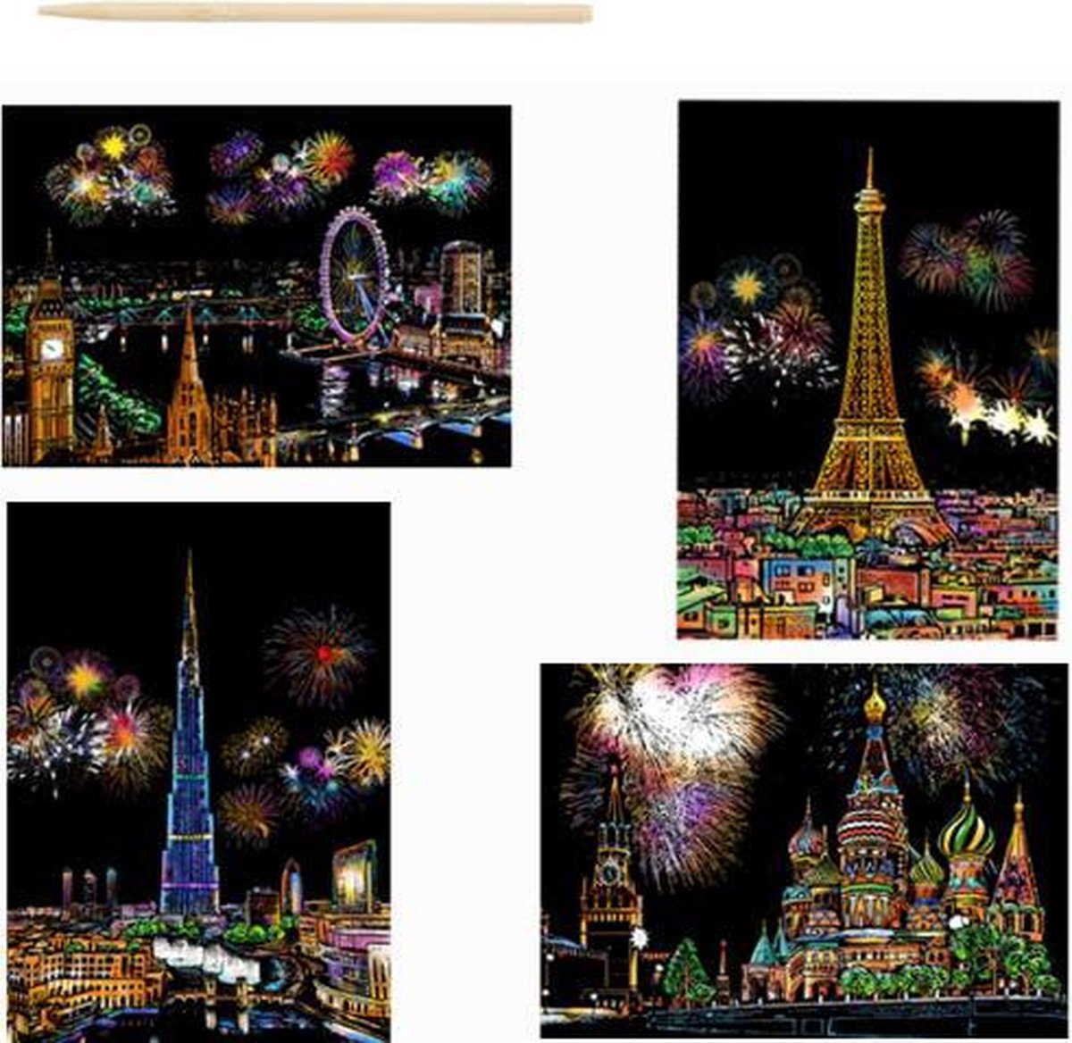 Met deze 9-in-1 Scratch Art A4 formaat set maak jij je eigen kunstwerken. Onze sets garanderen urenlang plezier voor jong en oud, ervaren en onervaren, met als resultaat prachtig kleurrijke kunstwerken om in te lijsten, op te hangen of cadeau te geven. Deze set bevat krasplaten in de style "Firework City (Vuurwerk)" Wat ontvang je? - 4 prachtige A4 formaat thema krastekeningen - 1 stuks gereedschap