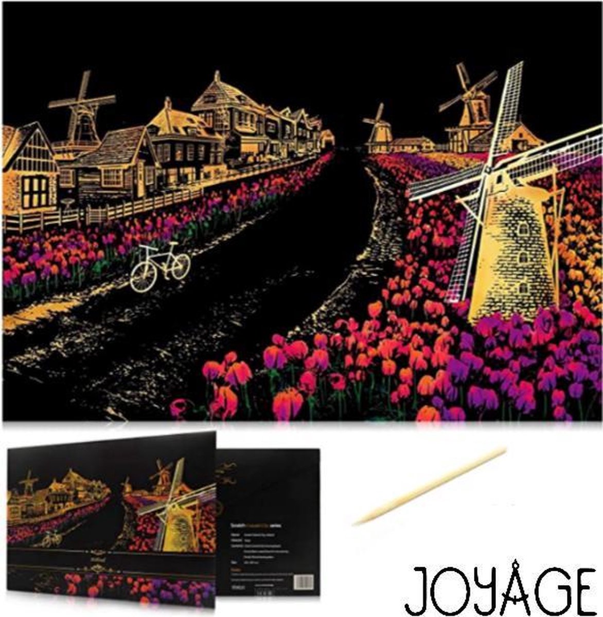 Beleef de nieuwste trend van het moment: met de Joyage Krastekeningen volwassenen van Hollandse tulpen en molens beleef je uren plezier. Neem de pen in je hand en laat stukje per stukje een prachtig kuntswerk verschijnen. Scratch painting is bijzonder kalmerend en ontstressend, neem de houten pen in je hand en je bent in een andere wereld. Pakket: - 1 Kras tekening Hollandse tulpen en molens (41 x 28 cm) - 1 Houten Kraspen - 1 Kraspen Deluxe - 1 lege kras tekening - Mooie cadeauverpakking in enveloppe Schaf nu je eigen Joyage Kras tekening aan en je start jouw Kras Avontuur! Zoek ‘Joyage scratch art’ op Bol.com en bekijk ons meest uitgebreide aanbod, maar liefst 20 verschillende designs – voor elk wat wils.