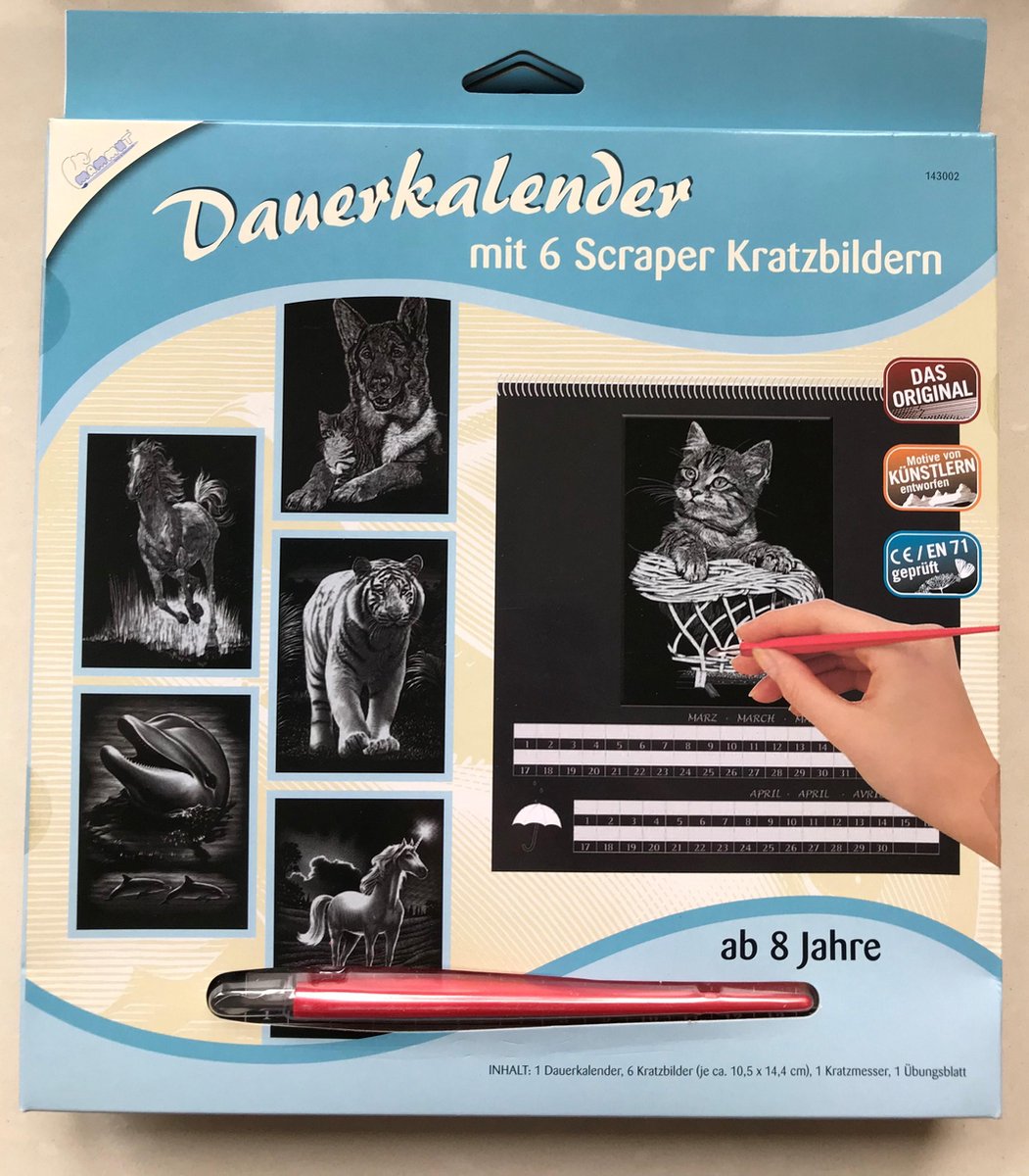 Dit set is een kalender die je kunt ophangen. Elke bladzijde heeft 2 maanden dus 6 in totaal. Voor elke blad is een schilderij die je kunt plaatsen. Door middel van een bijgeleverd mesje ga je een schilderij krassen die je op de kalender kan plaatsen. De maat van de kalender is 24.5x23 cm De maat van een schilderij is 10.5x14.4 cm De kleur is zilver.