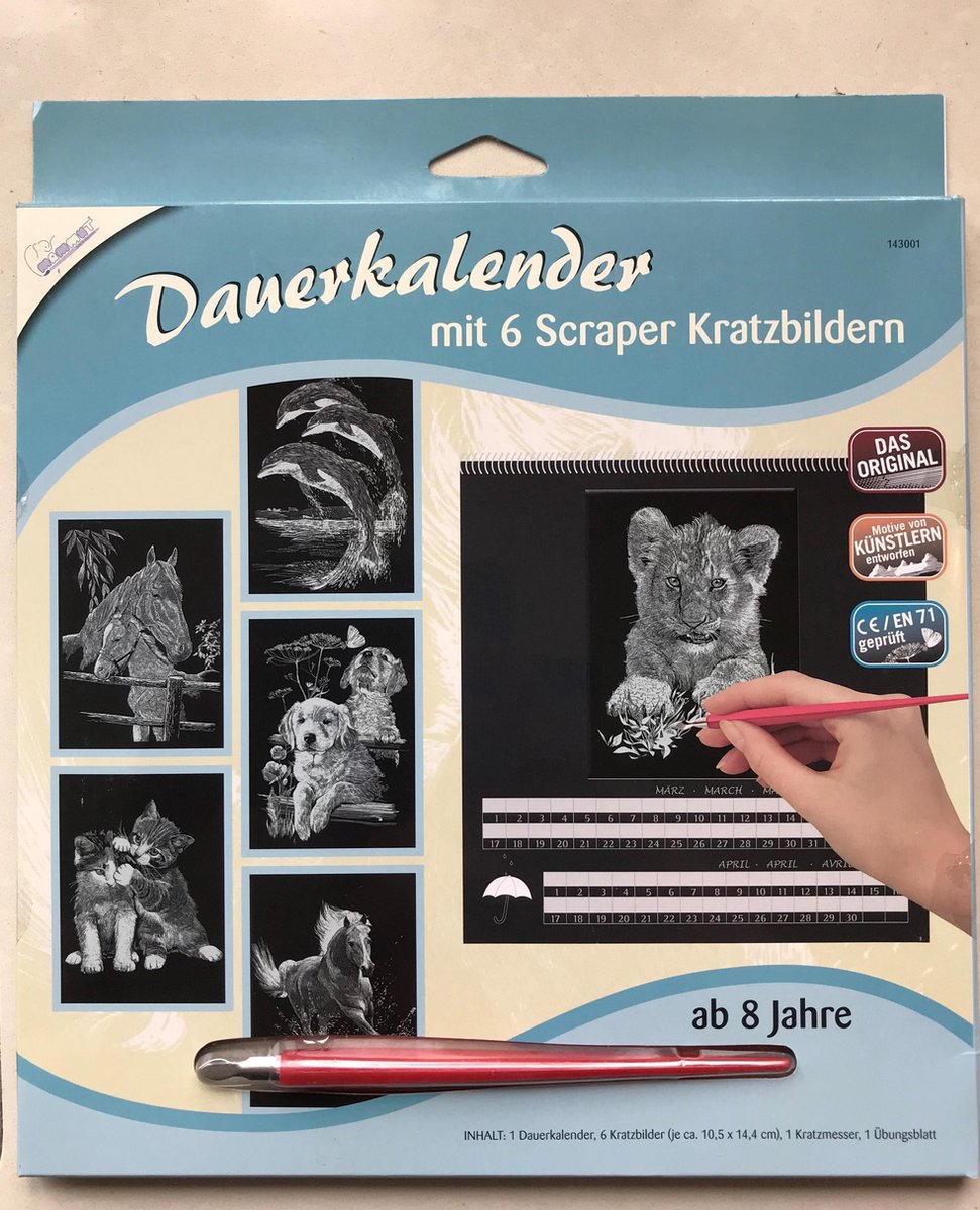 Dit set bevat een kalender die je kunt ophangen. Op elke bladzijde staan 2 maanden vermeld. Op elke bladzijde (6) is er ruimte om een kras schilderij te plaatsen die je zelf gaat maken. Scratching is een leuke hobby voor jong en oud. De schilderijen worden zilver. De kalender is 24.5x23 cm De schilderijen zijn 10.5x14.4 cm