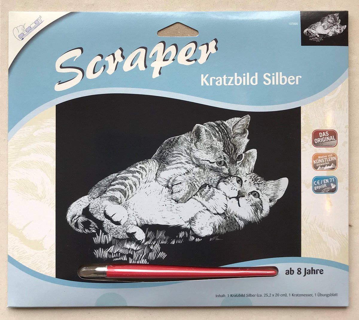 Scratching is een hobby voor iedereen en voor jong en oud. Door middel van een bijgeleverd mesje ga je een schilderij krassen. Dit schilderij is ongeveer 20x25 cm en heeft de kleur zilver. Het schilderij is een dik karton en van goede kwaliteit.