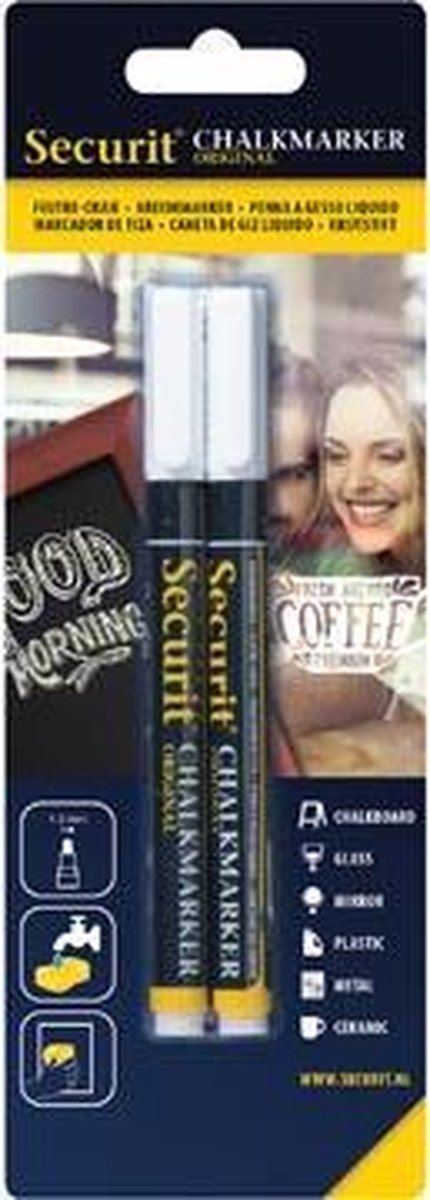 Fijne punt met schrijfbreedte 1-2 mm. Deze krijtmarker loopt niet uit, verkleurt niet en is bestand tegen lichte regen. Verwijderbaar met een spons en water.