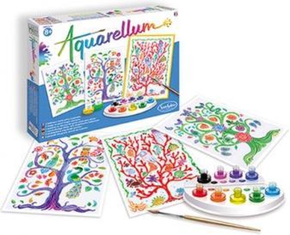 Gegarandeerd binnen de 'lijntjes' schilderen met een magisch resultaat! Het is mogelijk door deze fantastische Aquarellumset. Doordat de randen van de tekening dikgedrukt zijn, kunnen de kleuren niet overlopen. De kleuren zijn met elkaar te mengen. Inhoud: 3 embossed canvassen van 32 x 25 cm 9 x 5 ml vloeibare waterverf 1 palet, 1 pipetje, 1 kwast & instructies