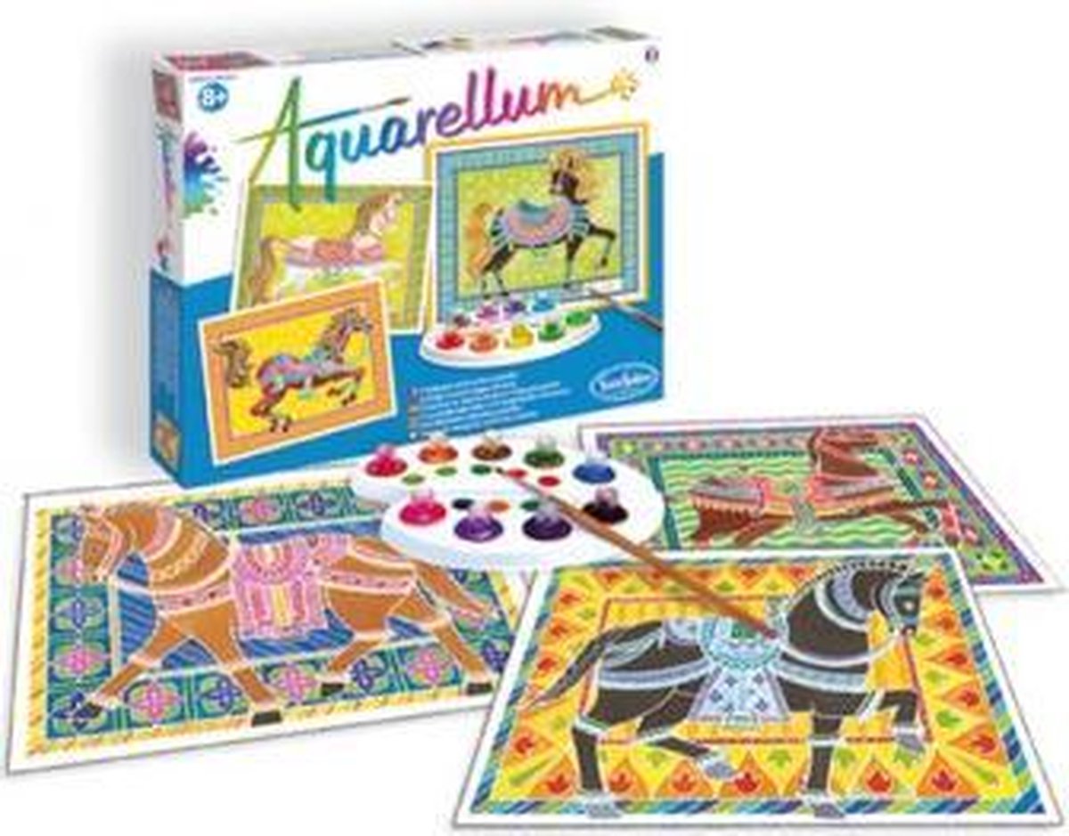 Gegarandeerd binnen de 'lijntjes' schilderen met een magisch resultaat! Het is mogelijk door deze fantastische Aquarellumset. Doordat de randen van de tekening dikgedrukt zijn, kunnen de kleuren niet overlopen. De kleuren zijn met elkaar te mengen. Inhoud: 3 embossed canvassen van 25 x 32 cm 9 x 5 ml vloeibare waterverf 1 palet, 1 pipetje, 1 kwast & instructies