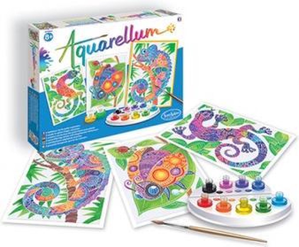 Gegarandeerd binnen de 'lijntjes' schilderen met een magisch resultaat! Het is mogelijk door deze fantastische Aquarellumset. Doordat de randen van de tekening dikgedrukt zijn, kunnen de kleuren niet overlopen. De kleuren zijn met elkaar te mengen. Inhoud: 3 embossed canvassen van 32 x 25 cm 9 x 5 ml vloeibare waterverf 1 palet, 1 pipetje, 1 kwast & instructies