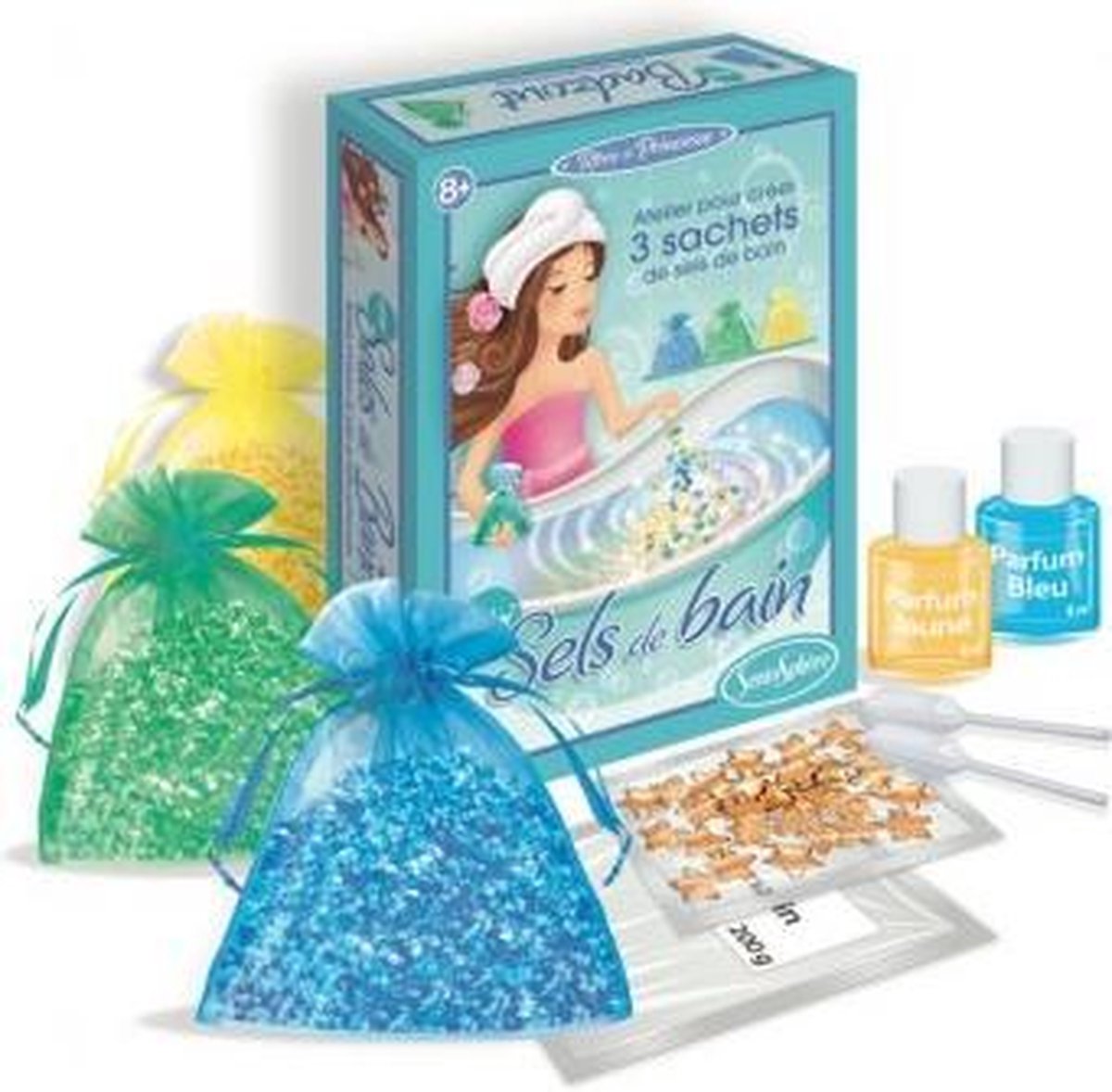 Een creatieve activiteit met eenvoudige, veilige en leuke manieren waarmee jong en oud de geheimen van het maken van cosmetische producten kunnen ontdekken. Voor jezelf of als geschenk, kun je genieten van een aangename ontspanning in bad. Inhoud: 100 gr zeezout 6 ml blauw parfum 6 ml geel parfum 2 pipetten 3 organza zakjes & instructies