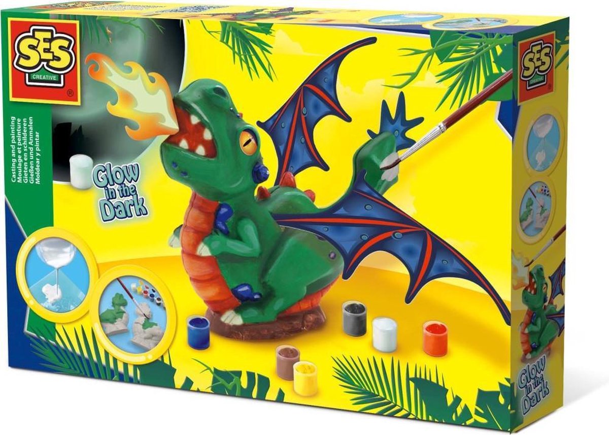 SES Creative gips gieten en schilderen draak Met deze gipsgietset giet je een grote, stoere draak van gips die je vervolgens zelf kan schilderen met lichtgevende glow in the dark verf. Giet het gips in de twee delen van de mal. Al het gips droog is, plak je beide delen van de draak aan elkaar met de bijgeleverde vleugels en het vuur ertussen. Schilder de draak in je favoriete kleuren en vergeet vooral de glow in the dark verf niet voor een extra cool effect. Gips Mal Gladstrijkkam 6 kleuren verf 1 potje glow in the dark verf Lijm Penseel Drukwerk Handleiding