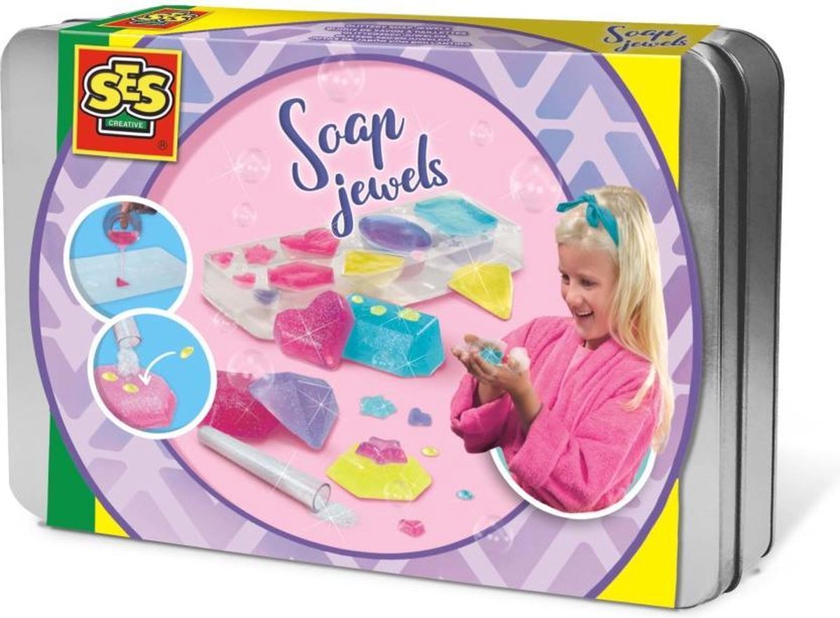 SES Creative glitterzeep juwelen Met deze luxe beauty set maak je zelf je eigen heerlijk geurende glitterzeep juwelen. Smelt de gekleurde zeep in de magnetron en giet het in de mal. Giet zeepjes met één kleur, meng kleuren, werk met verschillende gekleurde lagen en voeg glitters toe: je kan je zeep juwelen helemaal naar je eigen smaak maken. Zodra ze zijn uitgehard, berg je je glitterzeep juwelen veilig op in het luxe bewaarblik. Cosmetisch getest. 4 kleuren zeep Gietmal Glitter Handleiding Luxe bewaarblik