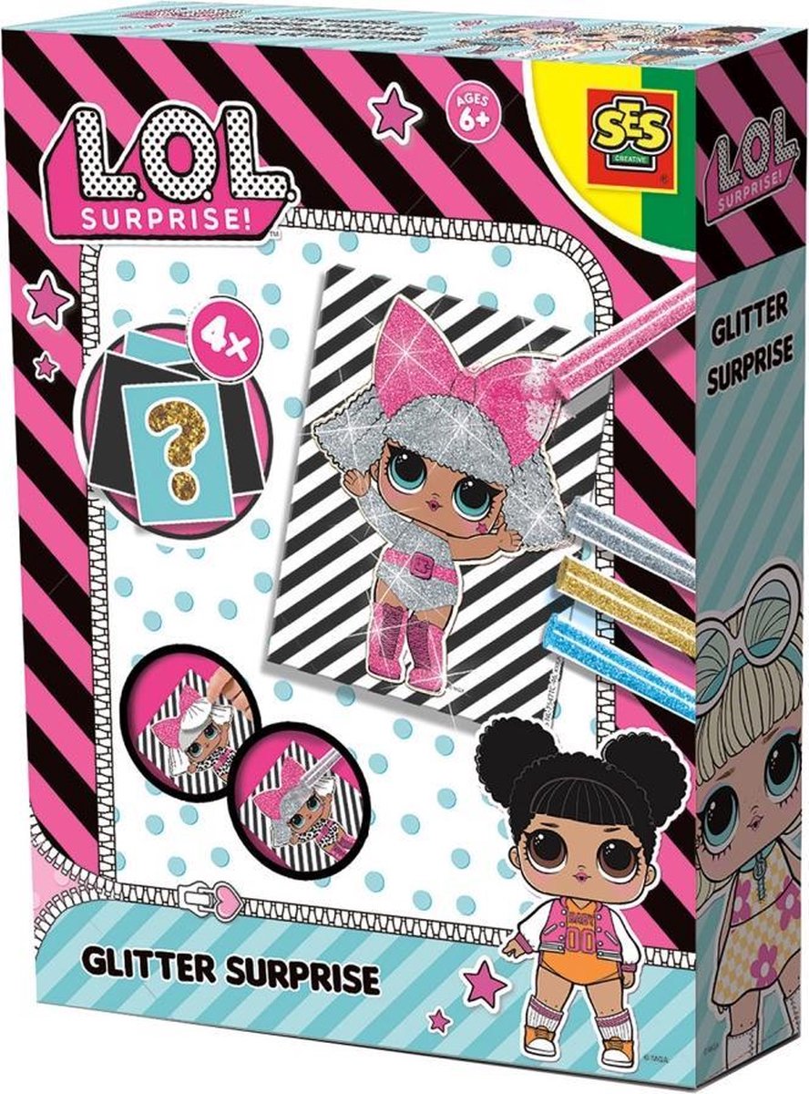 SES Creative L.O.L Surprise glitter surprise Verrassing! Open de doos en ontdek welke L.O.L. personages er in verborgen zijn. Verwijder eenvoudig de afzonderlijke secties van de stickerkaarten en strooi je glitter op elk gebied. Wauw! Je zult versteld staan van het sprankelende resultaat. 4 stickerkaarten met L.O.L. ontwerpen 4 kleuren glitter: roze, blauw, goud en zilver Handleiding