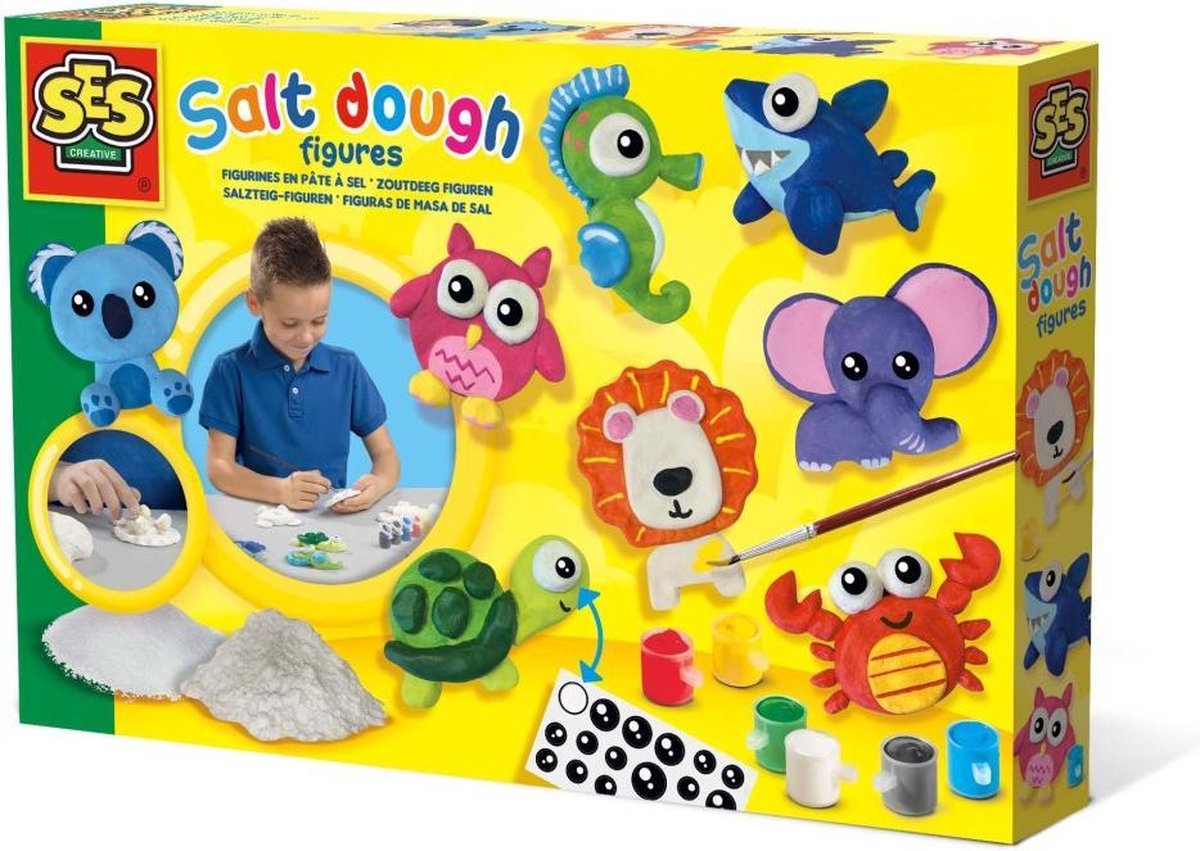 SES Creative zoutdeeg figuren Maak leuke zoutdeeg figuren. Kneed je eigen zoutdeeg met de bijgeleverde mix en vorm mooie figuren. Zodra je zoutdeeg figuren zijn uitgehard is het tijd om ze te schilderen en tot leven te laten komen met de stickeroogjes. Maak schattige diertjes van de verpakking of laat je eigen fantasie de vrije loop. De mogelijkheden zijn eindeloos! Mix voor zoutdeeg 6 kleuren verf Penseel Stickervel Handleiding