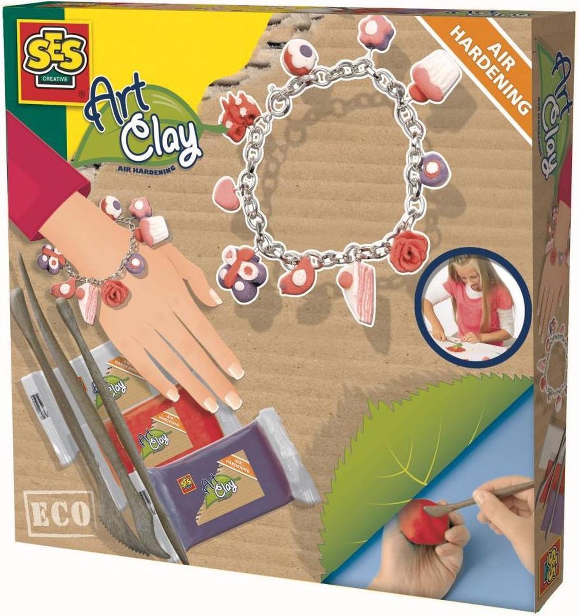 Eco Art Clay van Ses is een natuurlijke klei waarmee je kleinste boetseerwerkjes gemaakt kunnen worden. De klei is volledig natuurlijk en luchtdrogend, waardoor deze artistieke bezigheid erg geschikt is voor kinderen. Met deze set maak je zelf de bedeltjes bij het meegeleverde bedelarmbandje. In dit doosje vind je drie kleuren ECO Art Clay, drie soorten boetseerspatels, een bedelarmbandje, metaaldraad voor de bevestiging van de door jou gemaaktje bedeltjes en natuurlijk een instructieboekje.