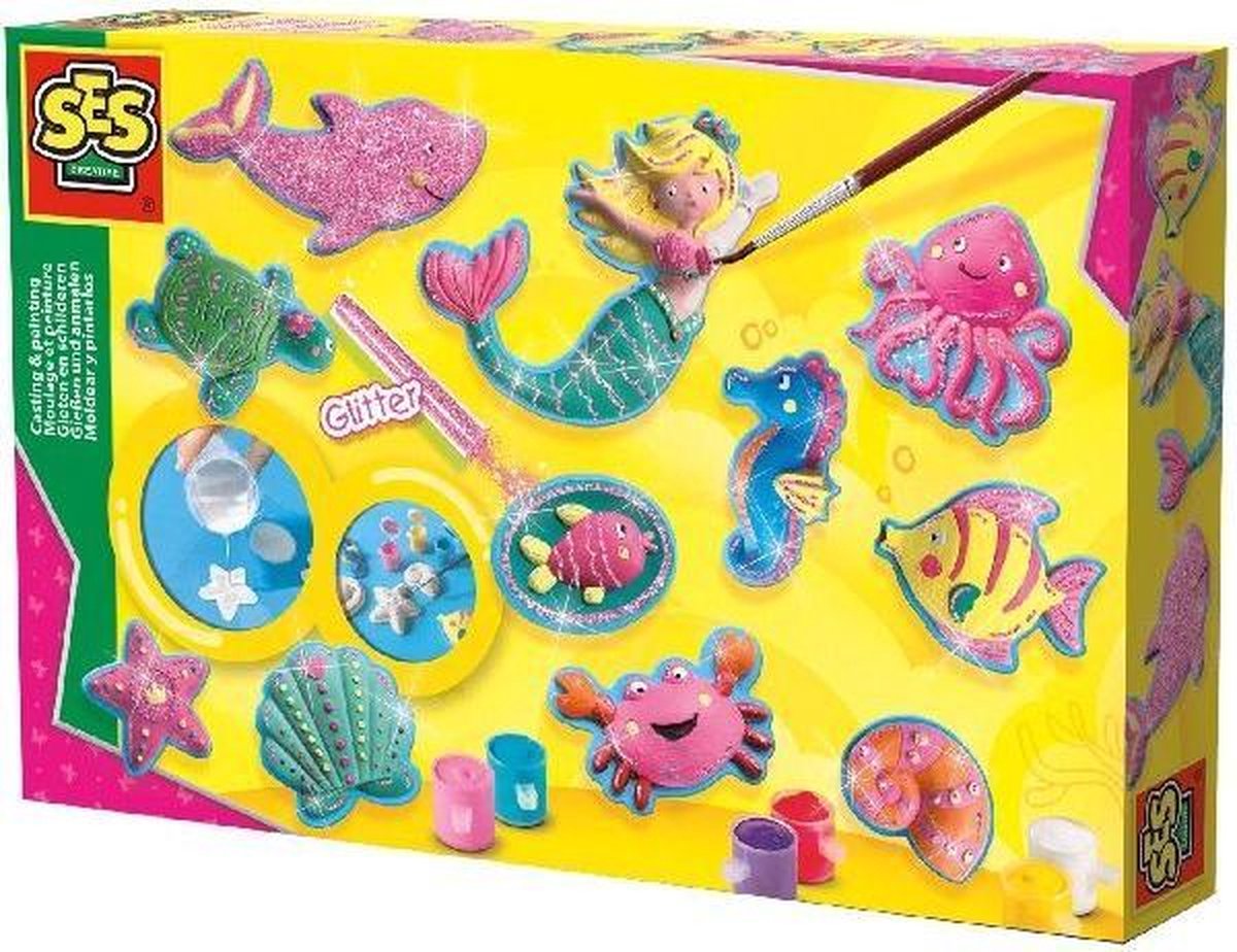 Met deze set van SES maak je eenvoudig de mooiste figuren uit de oceaan. Giet het gips in de mal en laat het uitharden. Pak dan de bijgeleverde verf erbij en schilder de figuurtjes naar wens. Leuk om te doen en een super resultaat! Gips gieten in reliëf Door de gedetailleerde mal is het resultaat geweldig Sneldrogend gips Thema vlinders Beschilder de beeldjes met de mooiste kleuren Heldere kleuren en goede dekking van de verf Incl. glitterstof Bevorderen creativiteit Instructies zijn te vinden achter op de verpakking De verf en het gips zijn goed uitwasbaar uit textiel en afwasbaar van de huid Gips Mal 6 kleuren trendy verf Penseel Gladstrijkkam Roze glitter