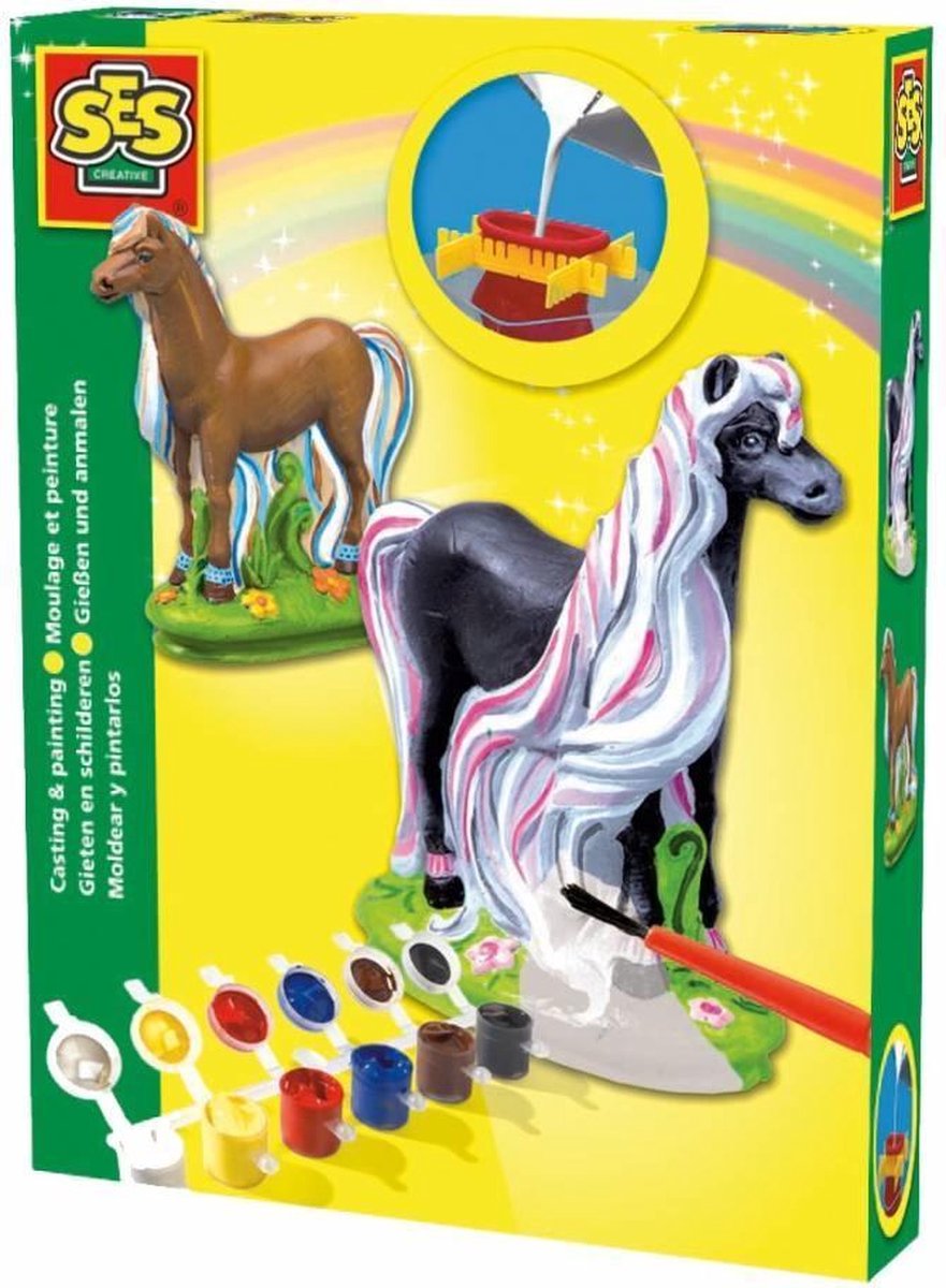 SES gips gieten 'Paard'. Meng het gips, giet het in de rubberen mal, hang hem daarna op de kop om het gips te laten drogen. Eenmaal opgedroogd kan je het paard schilderen in jouw favoriete kleur! Inclusief verf, penceel en instructies. Geschikt voor kinderen van 5 - 10 jaar.