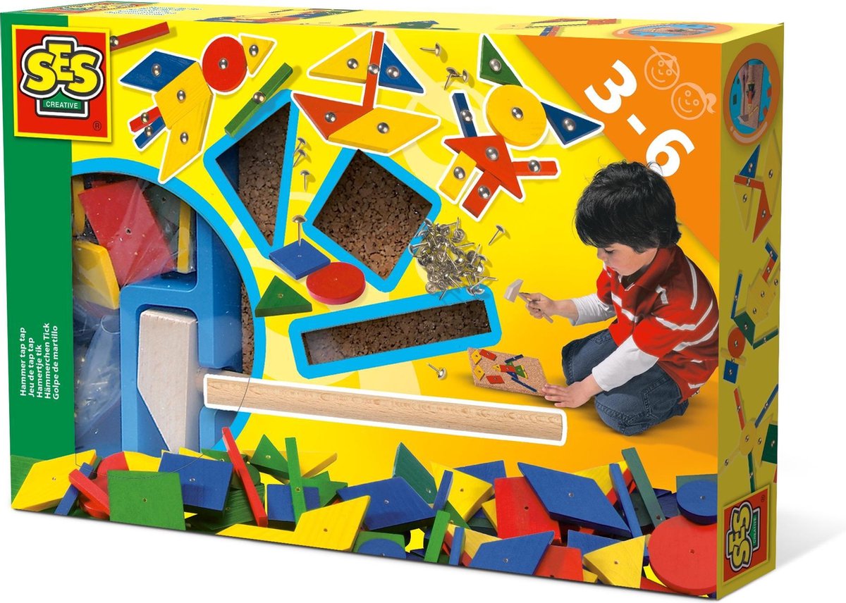 SES Hamertje Tik Original Hamertje tik met veel verschillende houten figuren waarmee je naar hartelust en vol fantasie kunt combineren. Eigenschappen Kurkbord Houten hamer Ongeveer 40 spijkers 30 houten vormen Blaadje met enkele voorbeelden
