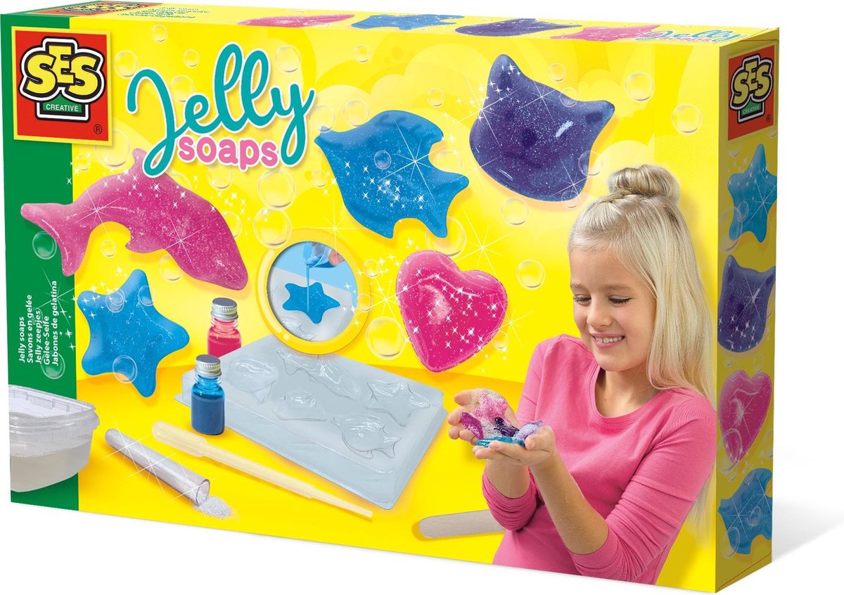 Maak je eigen jelly zeepjes! Met de meegeleverde ingrediënten en vormen maak je heerlijk geurende zeepjes. Druppel met de pipet de kleurstof door de basis zeep en roer het even goed door. Strooi er glitters door en giet het in de mal met vormen. Even geduld en dan zijn ze klaar.. je eigen gemaakte glibberige, glitter jelly zeepjes.
