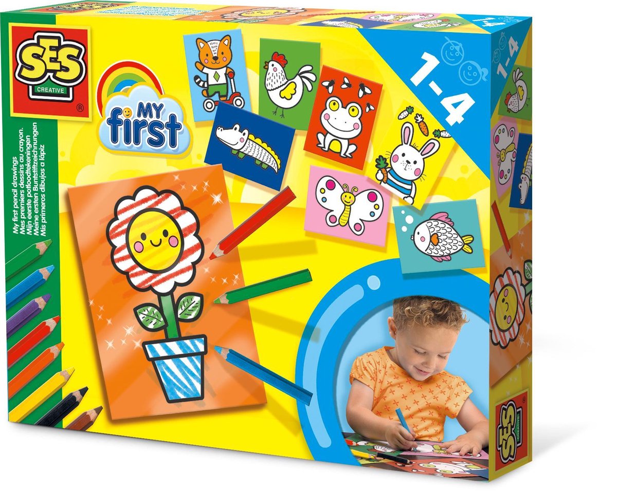 Wil je net zoals je grote broer of zus mooie tekeningen maken binnen de lijntjes, maar is dat nog een beetje te moeilijk? De speciale lak op de tekenkaarten van SES Mijn eerste potloodtekeningen zorgt ervoor dat je altijd binnen de lijntjes kleurt, ookal ga je er met je potlood buiten. Zo maak je altijd een mooie tekening voor de verjaardag van papa, mama, opa of oma Eigenschappen: - Geschikt voor kinderen vanaf 1 jaar; - Maak mooie potloodtekeningen; - Door de speciale spot-laklaag hecht de kleur alleen binnen de lijntjes, zodat je altijd mooie kunstwerken krijgt; - Leuke activiteit voor ouders met jonge kinderen; - Stimuleren van creativiteit; - Stimuleren van inbeeldingsvermogen; - Ontwikkelen motoriek.