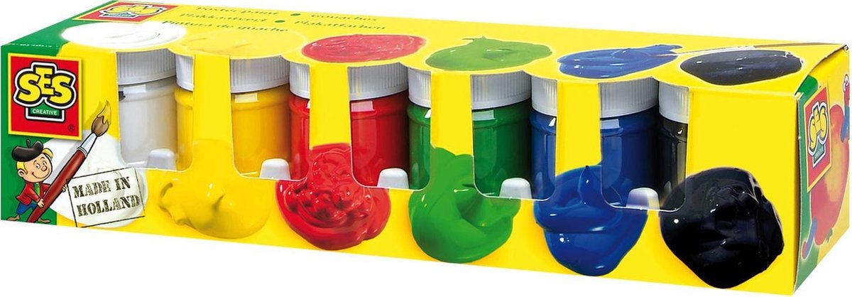De beginnende kunstenaar maakt de mooiste schilderijen met deze plakkaatverf. Zes kleuren, in potjes van 50 ml.