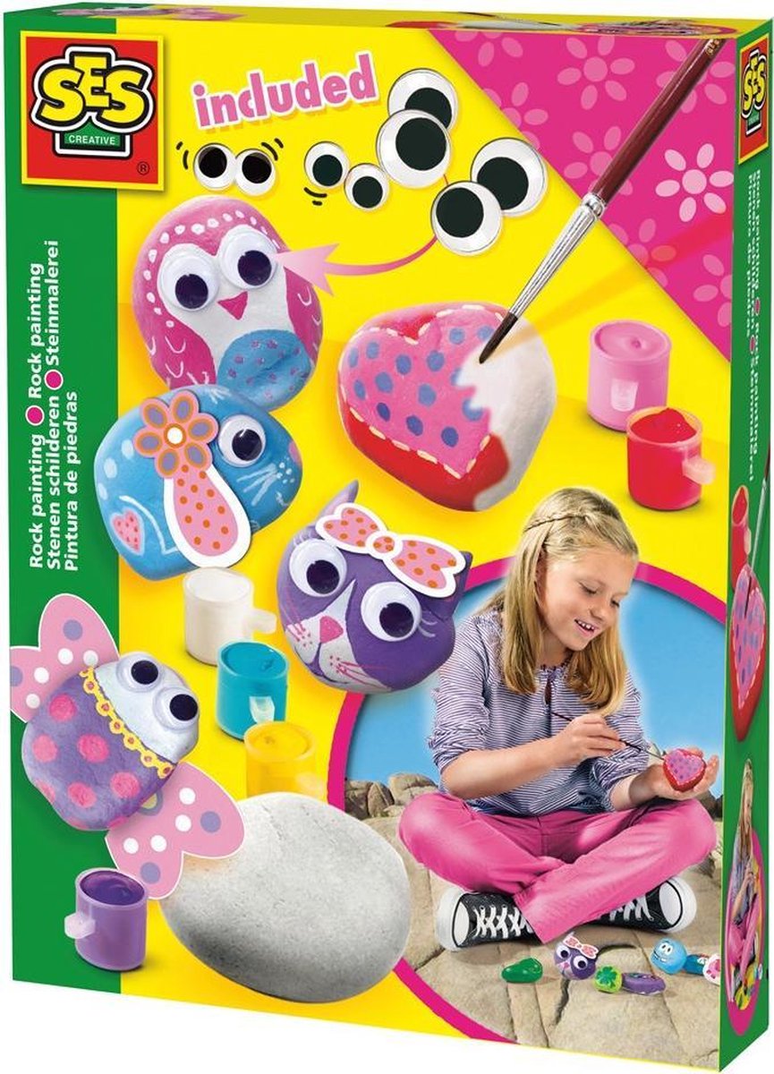 SES Stenen Schilderen Verschillende kleuren verf en een aantal mooi gevormde stenen die je kunt gaan beschilderen. Maak jij er ook van die leuke kleine beestjes van? De bijgeleverde oogjes maken het resultaat extra mooi. Met de producten van SES Creative ontwikkel je op een leuke en veilige manier je creativiteit, vaardigheden en kennis. Inhoud 6 kleuren verf 5 stenen Penseel Lijm Wiebeloogjes Eigenschappen Echte stenen Inclusief wiebeloogjes