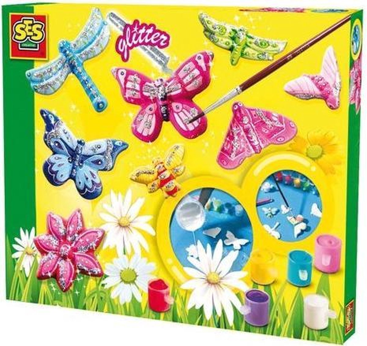 Maak met de reliëfgietvorm vlinders en libelles, versier ze met verf en glitter! inhoud: 6 kleuren verf, penseel, glitter en gips. leeftijd: 5–10 jaar.