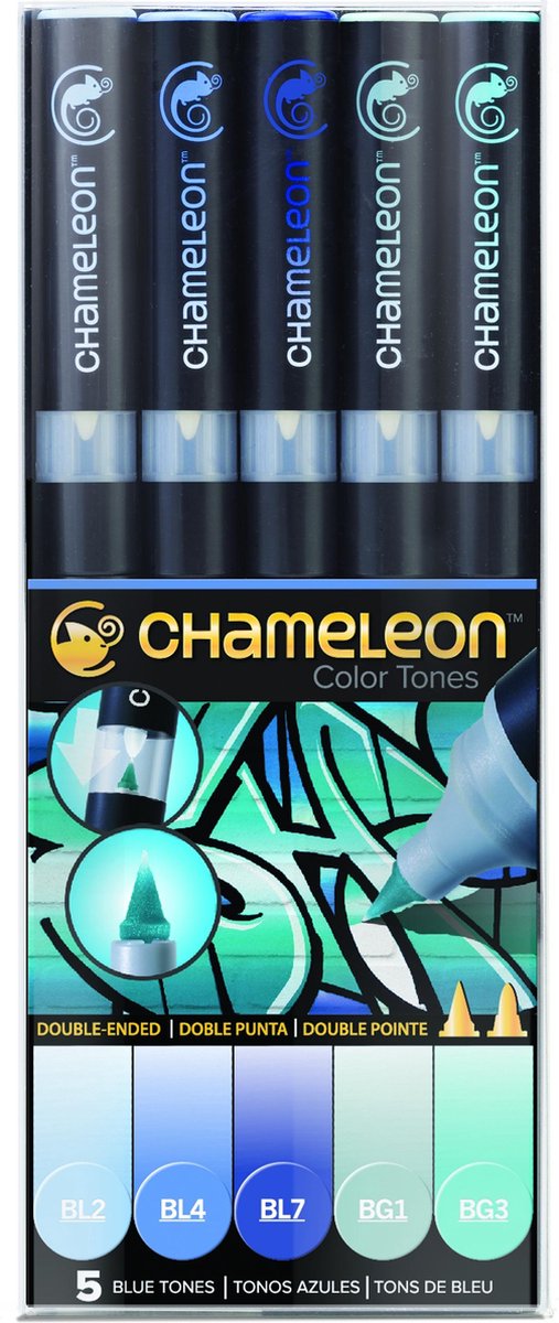 Set met 5 kleur Chameleon stiften : Baby Blue, Cornflower Blue, Indigo, Lagoon, Turquoise en 2 reserve penseelpuntjes. De inkt is bij te vullen, de verdunner ook en de punten zijn vervangbaar. Eigenschappen van de Chameleon color tone marker: Dubbelzijdige stift. Japanse super zachte penseel punt en kogel punt. Professionele kwaliteit inkt op alcohol basis. Permanent op de meeste oppervlakken. Te gebruiken in combinatie met alle andere alcohol stiften. Niet giftig en geen sterke geur. Ideaal voor alle papier hobbies, therapeutisch kleuren, Manga tekenen, grafische toepassingen en fijne kunst.