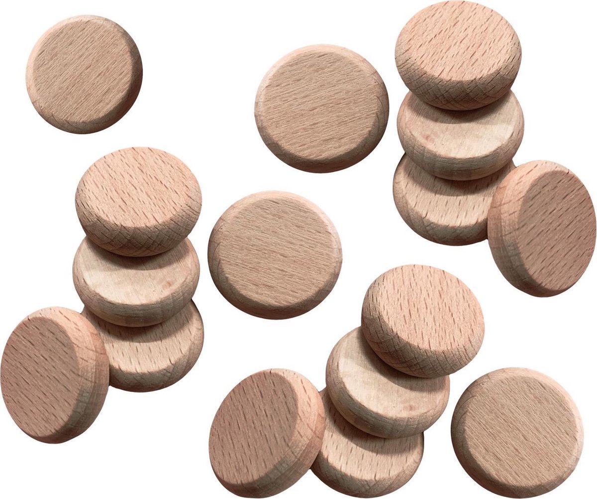 Mooi afgewerkte schijfjes met een diameter van 2.5 cm. Zoals op de fotos te zien is: de randen van deze schijven zijn sterk afgerond (afgeschuind). We verkopen deze houten schijven in een set van 100 stuks. Afmeting: diameter = 2.5 cm, dikte = 8 mm Materiaal: hout (beuken) Aantal stuks in deze set: 100