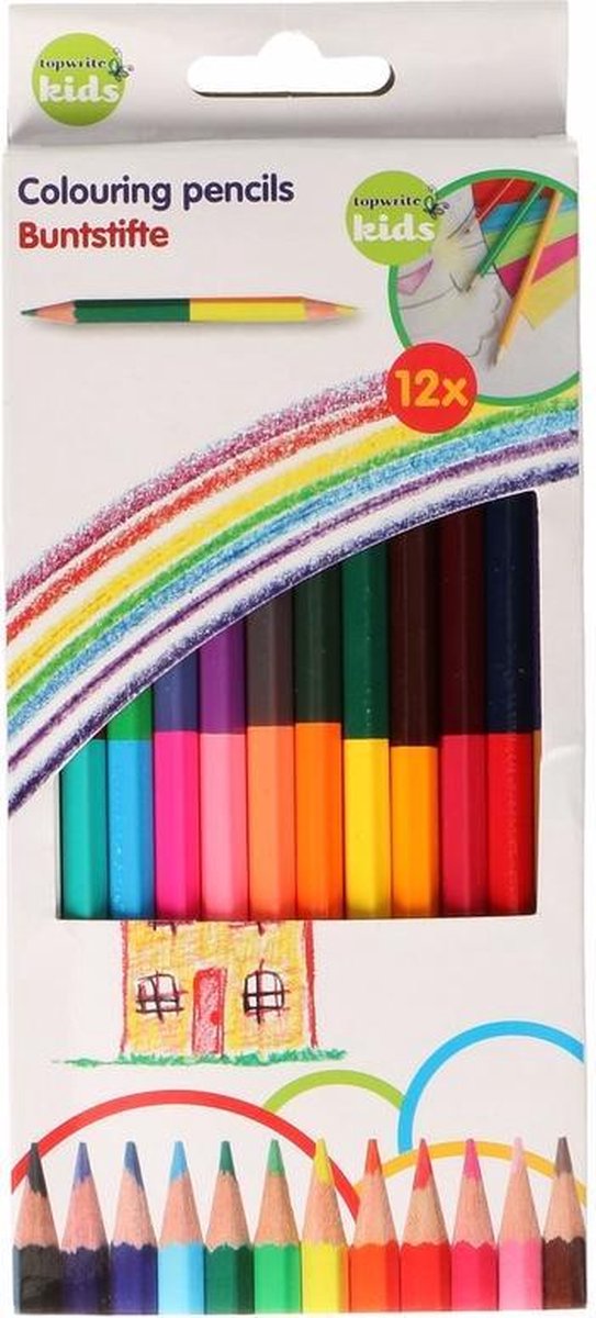 Set van 12 dubbelzijdige kleurpotloden. Deze kleurpotloden van het merk Topwrite Kids hebben ieder twee kleuren, dus aan beide zijden te gebruiken. De potloden hebben 24 kleuren in totaal.