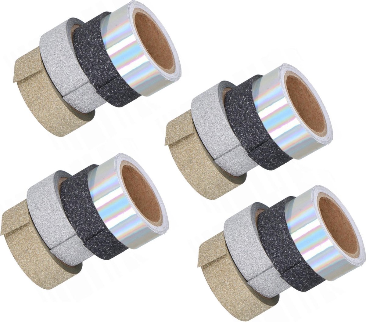 Set van 16 rollen glittertape. Speciaal gemaakt voor decoratieprojecten. Lengte: 4 rollen van 2,5 meter, 12 rollen van 4 meter Doorsnee: 1,5 cm Kleuren/types: zilver, goud, zwart en spiegelend