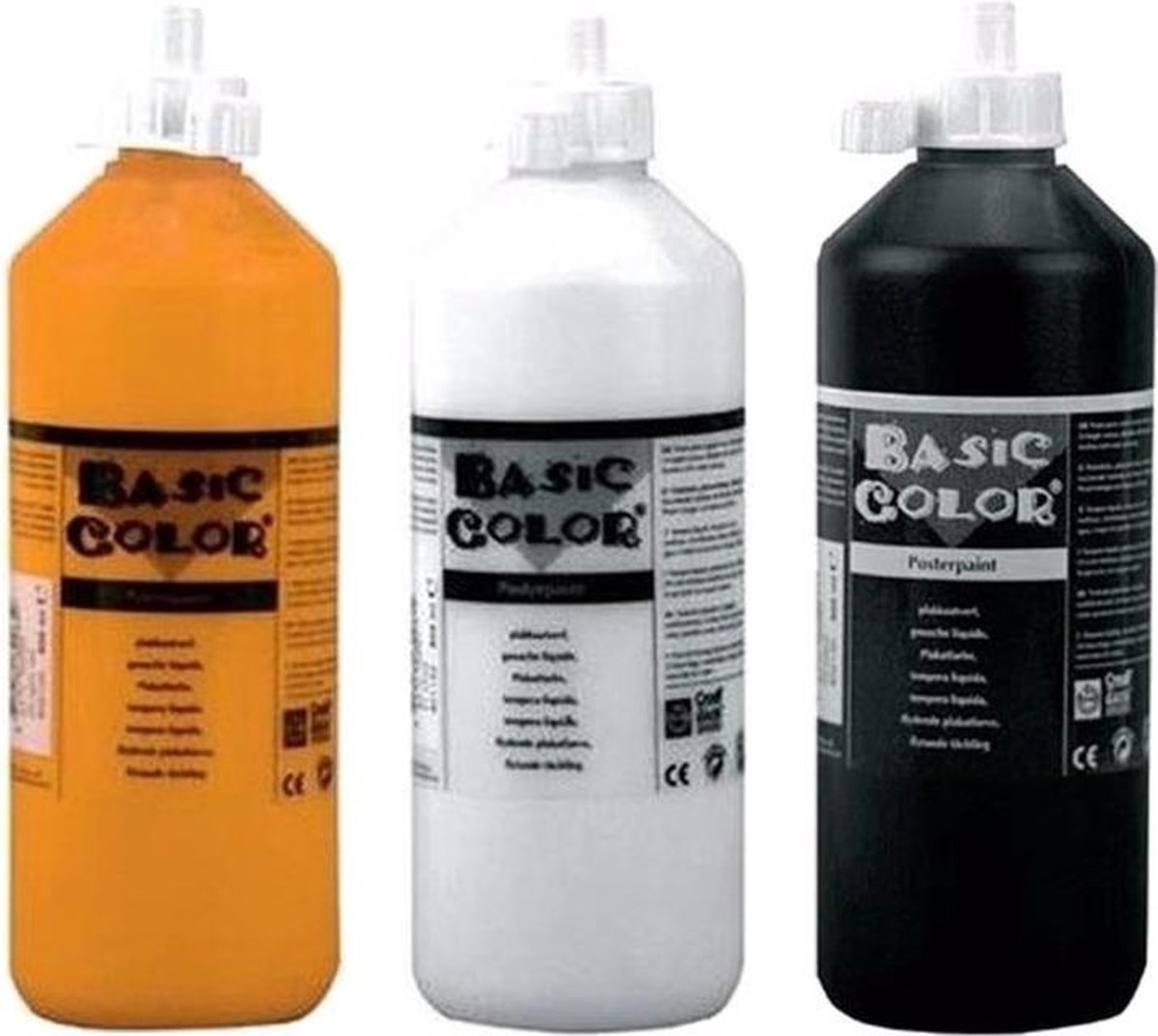 Set van 3x knijpflessen in de kleuren (zwart-oranje-wit) hobby knutselen kinder plakkatverf op waterbasis. Elke fles heeft een inhoud van 500 ml. Schilderen en verf artikelen materialen. De verf is gebruiksklaar en hecht goed op de meeste ondergronden. Bovendien kun je de verf mengen met andere kleuren plakkaatverf, zodat je keuze hebt uit nog meer kleuren. Wanneer de verf opgedroogd is heeft deze een matte kleur. Pak enkel nog de penselen en een canvas doek op en ga aan de slag. bestaande uit 1x Witte verf op waterbasis 500 ml, 1x Oranje verf op waterbasis 500 ml, 1x Zwarte verf op waterbasis 500 ml