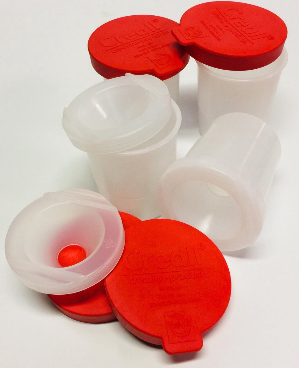 Creall non spil pot of in het nederlands anti-knoeipotten set van 4 stuks van 320 ml. Te gebruiken voor verf of lijm. Met binnen deksel en afsluitdeksel. Voorkomt knoeien als het potje omvalt. Asluitbaar om resterende verf te bewaren. Verkrijgbaar in 2 formaten.