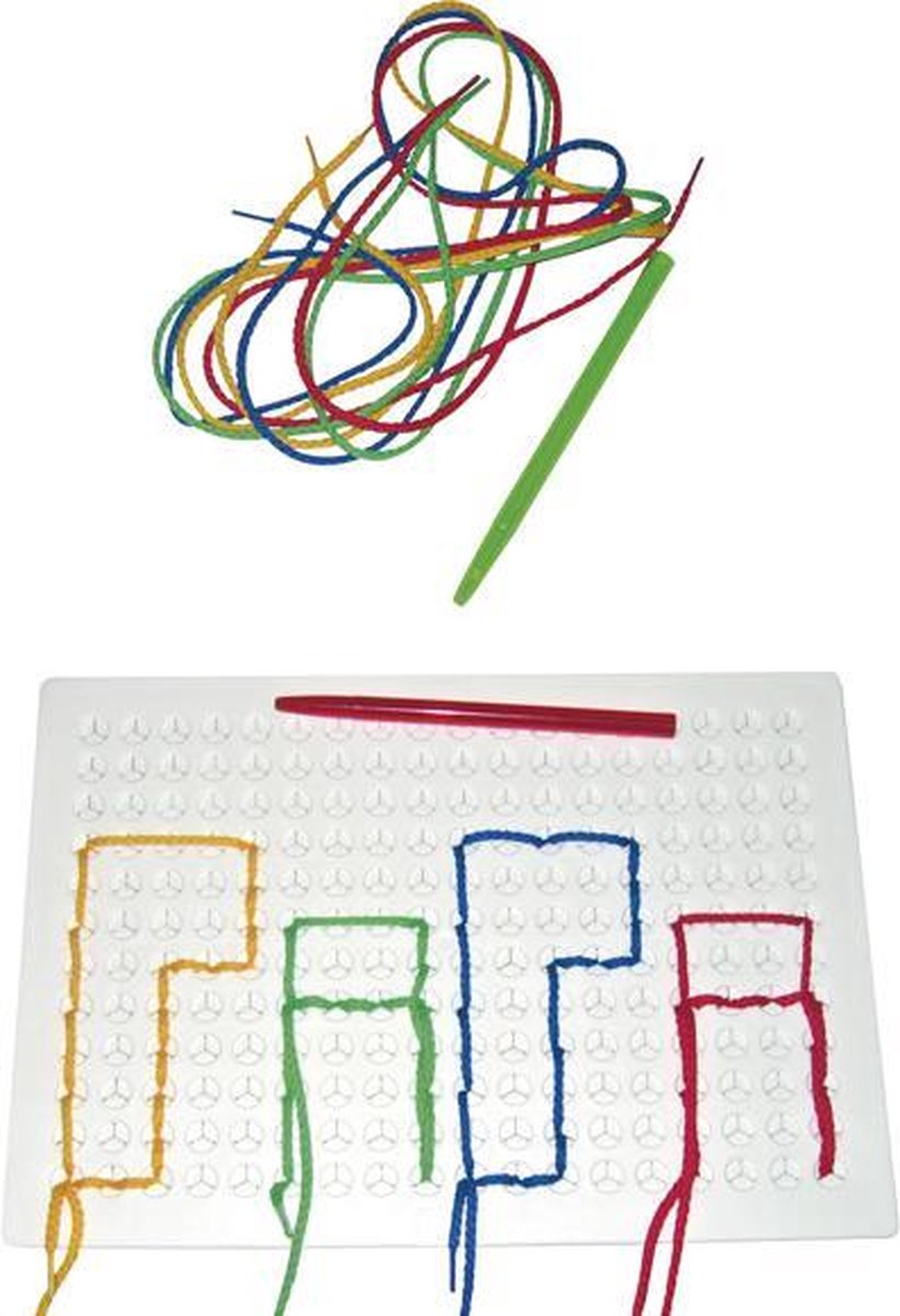 Voor kleine en grote motieven. De pennen worden gebruikt om de koorden van kruisgat naar kruisgat te brengen. Kan ook makkelijk weer verwijdert worden. Bevordert de hand-oog coördinatie, creativiteit en concentratie. Inhoud: 4 borden van 19,5 x 28 cm, 4 x 4 gekleurde koorden á 1 meter, 4 paarse koorden á 1,50 meter, 4 draadpennen. Materiaal: plaat van zacht, hoogwaardig PE- kunststof, koorden van PP. Geschikt voor kinderen vanaf 3 jaar.