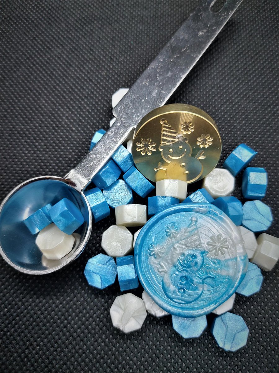 SET: Waxzegels / Lakzegels, smeltlepel & stempel sneeuwpop voor het maken van een lakstempel - Blauw/wit Kerst! - Knutselen - Knutselpakket - Kerstkaarten