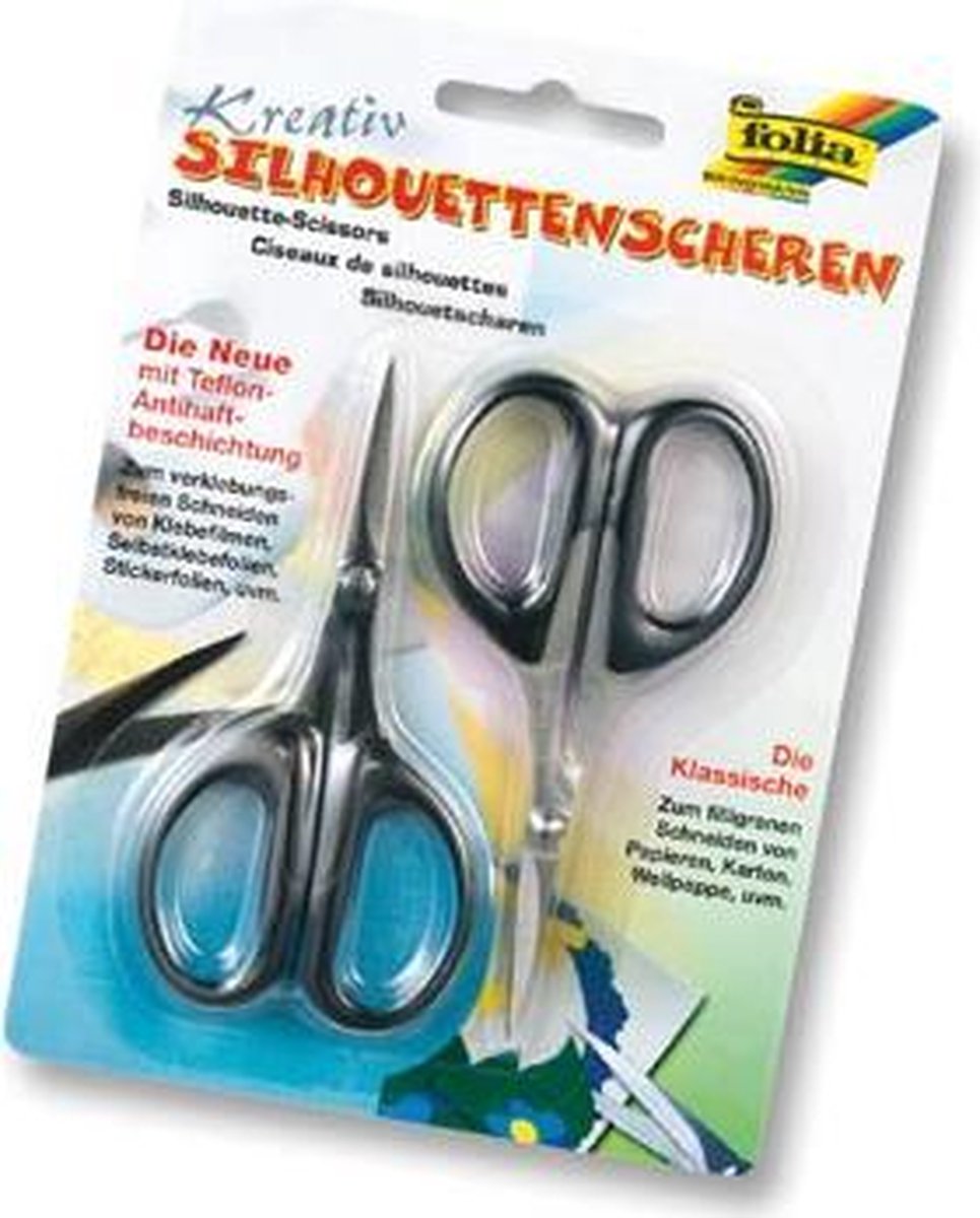 2 scharen voor het knippen van filigraan/silhouetten: één met een Teflon coating en één zonder. Bij het knippen van bv. plakband verhindert deze Teflon coating het aan elkaar plakken van de schaarhelften. Lengte: 10,5 cm. Op blister.