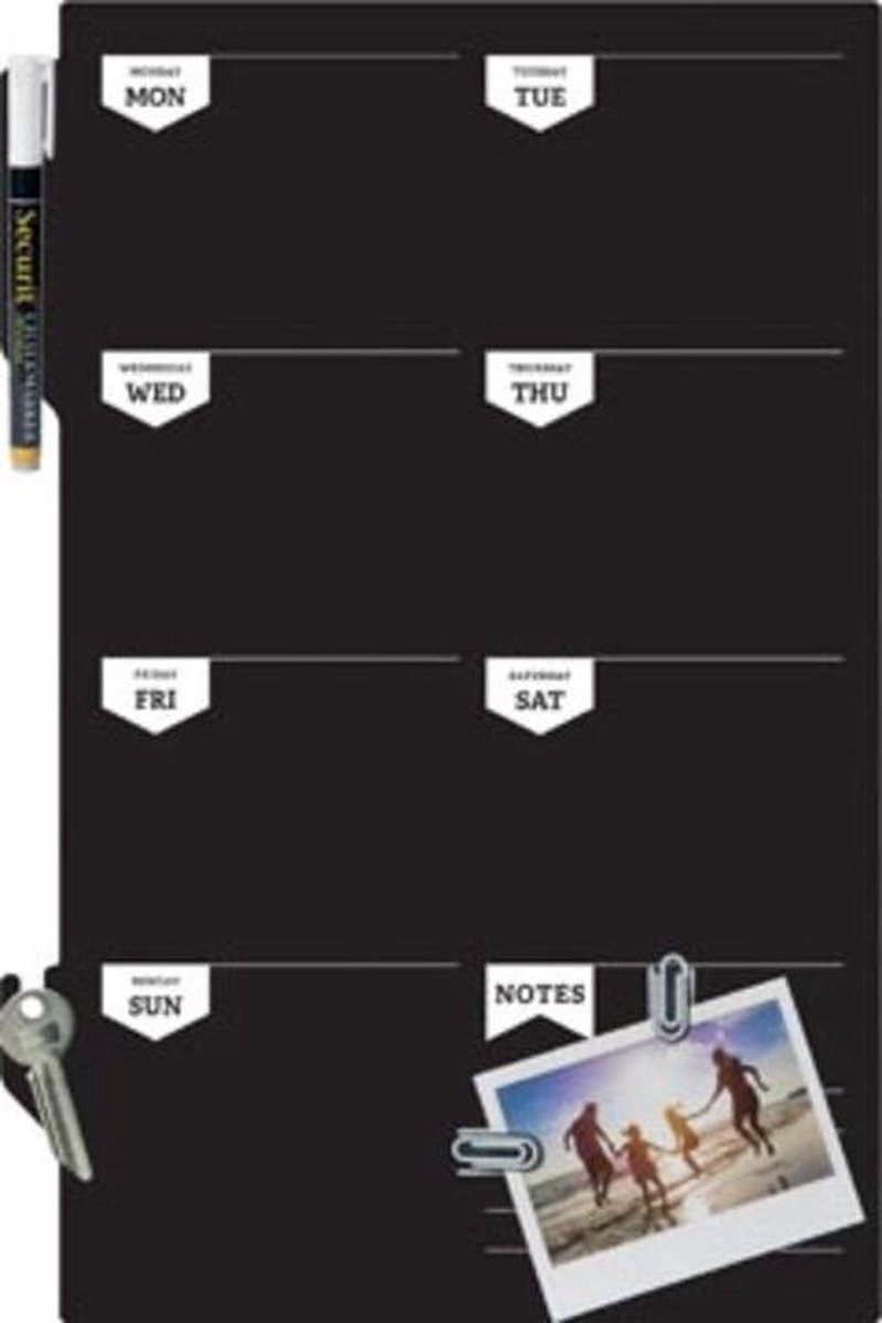 Securit Silhouette krijtbord weekplanner. Aan de zijkant van het bord mogelijkheid om sleutels- en stift op te hangen. Op het bord zijn 2 clips bevestigd om notities of foto's op het bord te bevestigen. Voor het beste schrijfresultaat gebruikt u de Securit krijtstiften. Krijtbord is eenvoudig te reinigen met een vochtige doek. Deze weekplanner wordt geleverd met bevestigingsmateriaal en één witte krijtstift. Afmetingen: 45 x 30 cm.
