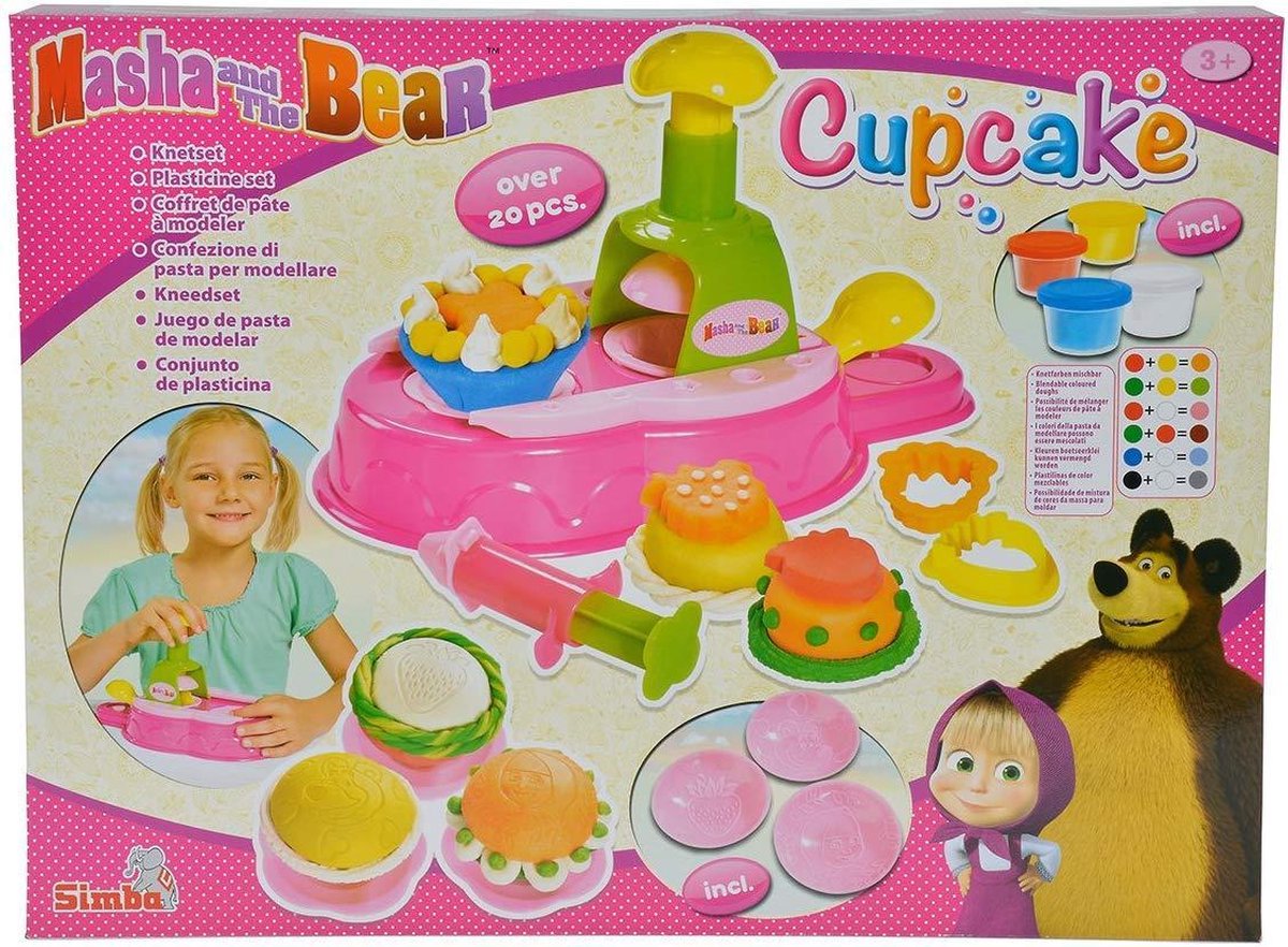 Maak je eigen Masha en Michka cupcakes met je plasticinedoos Veel accessoires worden meegeleverd om er een echte bries van te maken: 4 verschillende modelleerdeeg, 3 vormen, 1 spuit met 4 verschillende tips, 4 koekjessnijders, 1 mes, 1 spatel en 1 steun voor het vormen van het deeg Vergeet niet om uw plasticine na elk gebruik in de hersluitbare potten te doen