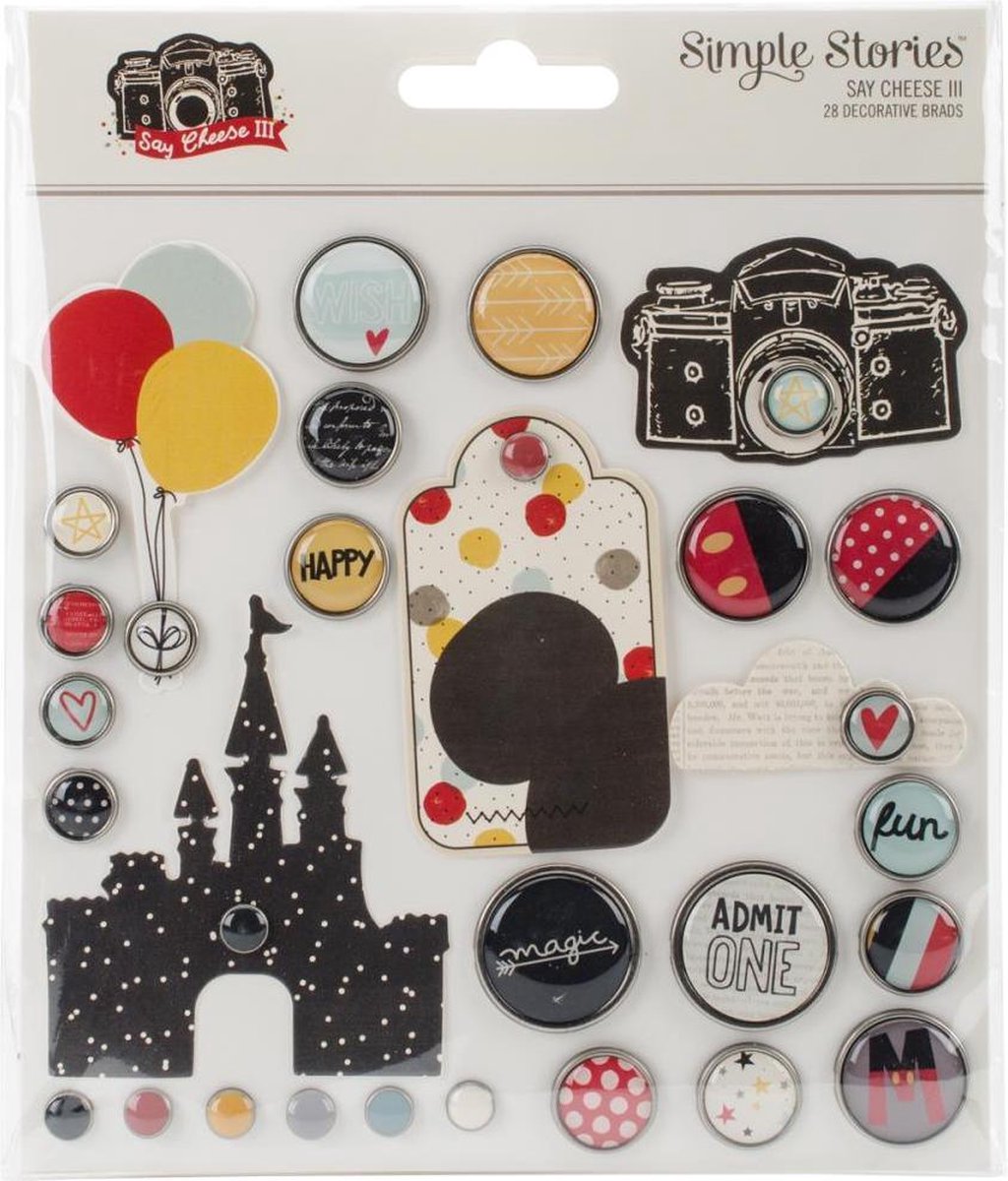 Simple Stories-Say Cheese III Metal Brads & Tags. These are the perfect addition to your next paper crafting project. This package contains twenty-eight assorted metal brads and tags on one 6x5 inch backing sheet.