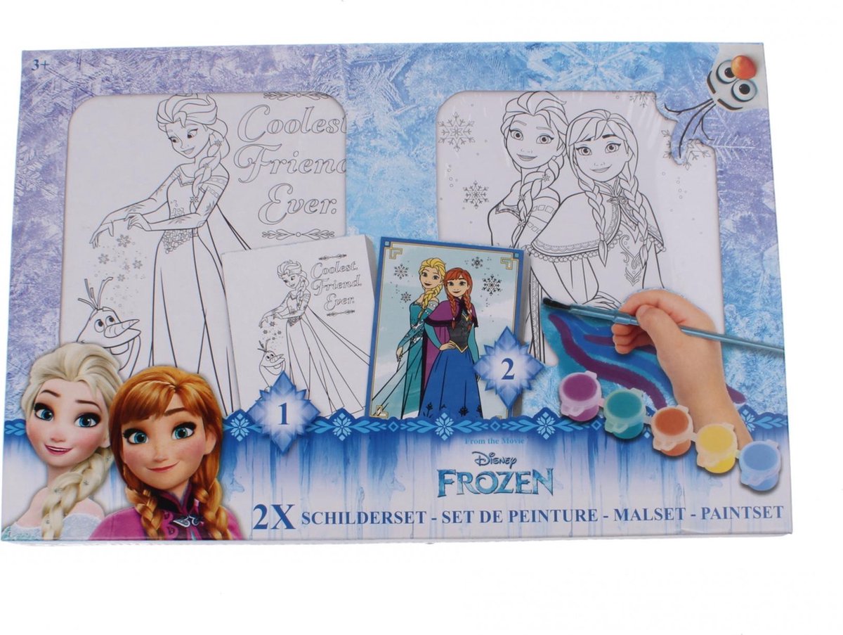 Slammer Frozen schilderset Schilder de mooiste tekeningen van jouw favoriete personages uit Frozen. In de set zitten twee superleuke tekeningen, één penseel en vijf verschillende kleuren verf. Specificaties: Kleur: multicolor Geslacht: meisjes Materiaal: karton Afmetingen: 31 x 20,5 x 2 cm (L x B x D) Leeftijd: vanaf 3 jaar Inhoud: 1 Penseel 2 Tekeningen 5 Kleuren verf