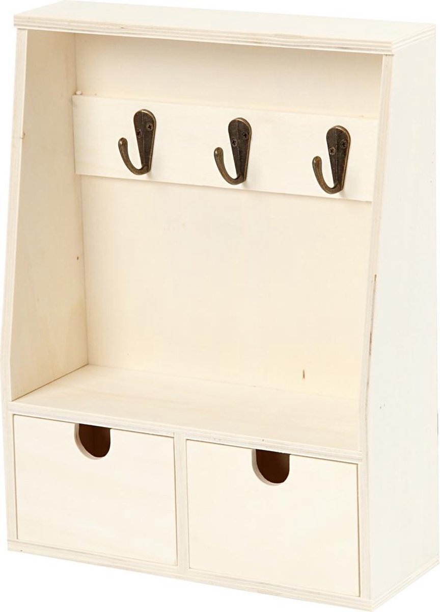 Sleutelkast met 3 haken en 2 lades aan de onderkant.
