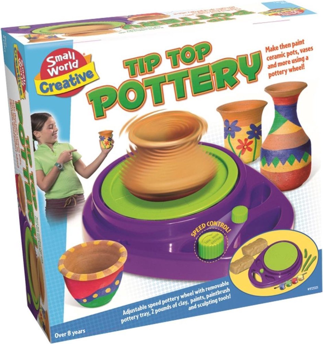 Small World Creative Tip Top Pottery Pottenbakkersschijf op batterijen. Hiermee kun je beeldhouwen en keramische vazen, potten en nog veel meer creëren. Het aardewerk wiel heeft een instelbare snelheidsregeling en een verwijderbare aardewerklade. 4 verfpotten Penseel 2 beeldhouw-gereedschappen 2 pond klei Exclusief 2 AA-batterijen Geschikt voor kinderen vanaf 8 jaar