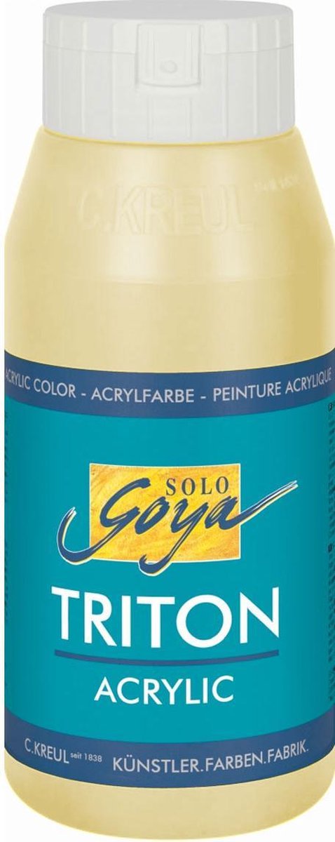 Solo Goya TRITON Acrylverf – 750ml Solo Goya TRITON acrylverf heeft een goede dekking, in het bijzonder productief, waterverdunbaar, mengbaar, sneldrogend, licht echt, waterbestendig, voor papier, hout, canvas en karton Dankzij het hoge pigmentaandeel heeft deze acrylverf een heldere kleurintensiteit. De gebruiksklare verf is eenvoudig met water te verdunnen en alle kleuren zijn goed onderling mengbaar, is na het drogen watervast en vergeelt niet. Smeert makkelijk en lichtecht. 1 pot van 750ml is genoeg om oppervlak van 3 à 4 m2 te bedekken. Aanvullende beschrijving: – hoge kleurintensiteit, briljante helderheid – zeer goede dekking, bevat lichtechte pigmenten – zachte, soepele consistentie – gemiddelde viscositeit – romig overschilderbaar – waterverdunbaar – mengbaar met elkaar – droogt snel en gelijkmatig tot een satijnen finish – waterdicht na het drogen – komt overeen met DIN EN 71-3 Voorbeelden van toepassingen: – voor het schilderen van papier, karton,