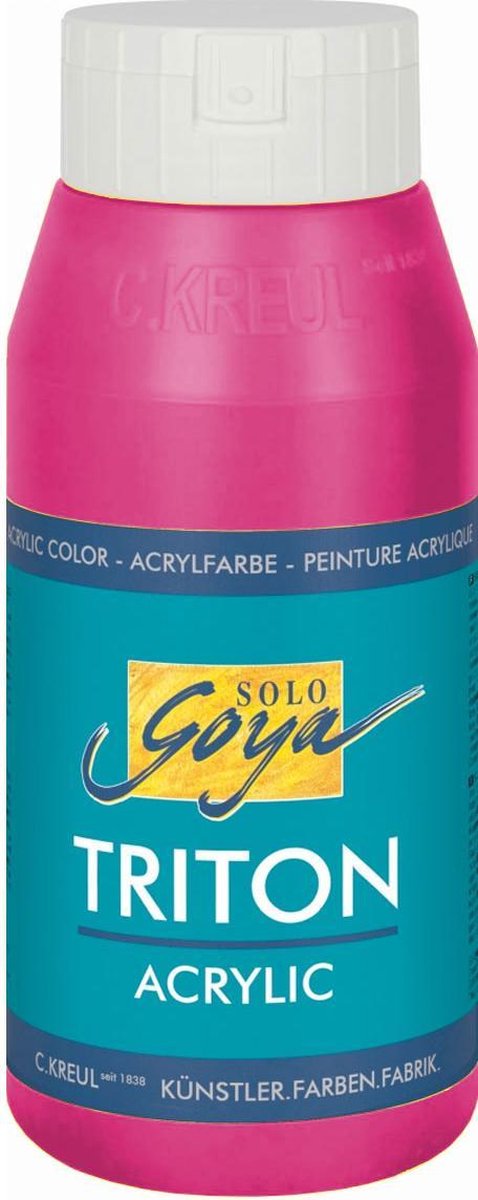 Solo Goya TRITON Acrylverf – 750ml Solo Goya TRITON acrylverf heeft een goede dekking, in het bijzonder productief, waterverdunbaar, mengbaar, sneldrogend, licht echt, waterbestendig, voor papier, hout, canvas en karton Dankzij het hoge pigmentaandeel heeft deze acrylverf een heldere kleurintensiteit. De gebruiksklare verf is eenvoudig met water te verdunnen en alle kleuren zijn goed onderling mengbaar, is na het drogen watervast en vergeelt niet. Smeert makkelijk en lichtecht. 1 pot van 750ml is genoeg om oppervlak van 3 à 4 m2 te bedekken. Aanvullende beschrijving: – hoge kleurintensiteit, briljante helderheid – zeer goede dekking, bevat lichtechte pigmenten – zachte, soepele consistentie – gemiddelde viscositeit – romig overschilderbaar – waterverdunbaar – mengbaar met elkaar – droogt snel en gelijkmatig tot een satijnen finish – waterdicht na het drogen – komt overeen met DIN EN 71-3 Voorbeelden van toepassingen: – voor het schilderen van papier, karton,