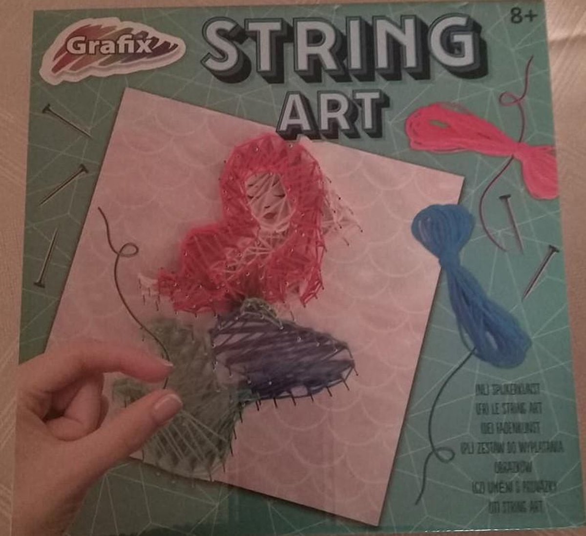 spijkerkunst met touw/ vanaf 8 jaar, niet onder 3 jaar/ inhoud 4 items inhoud: spijkers, touw 4 kleuren, plakband en 3 verschillende vellen karton van 19,5 cm