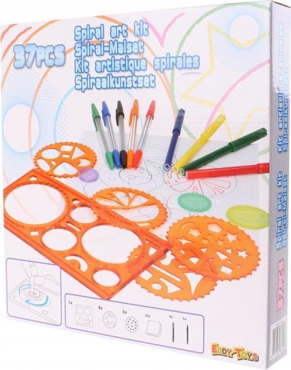 Eddy Toys spiraalkunstset Super leuke spiraalkunstset waarmee jij de allermooiste tekeningen maakt. Specificaties: Kleur: oranje Materiaal: kunststof Afmetingen verpakking: 26 x 26 x 4 cm (L x B x D) Inhoud: 8 Sjablonen 20 Vellen 4 Stiften 5 Kleurpennen