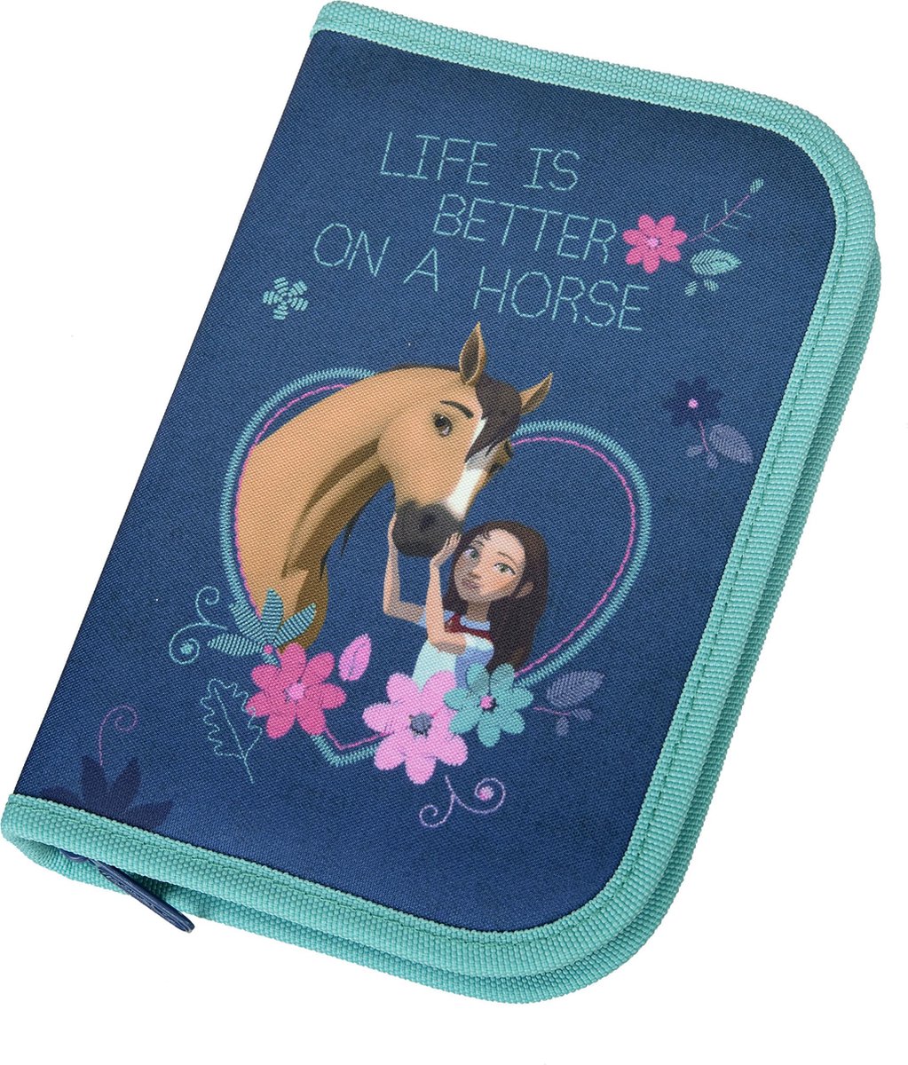 Nooit meer zoeken naar een pen of potlood! Want in deze goed gevulde etui vind je alles wat je nodig hebt. In de etui heeft alles zijn eigen plekje: kleurpotloden, stiften, puntenslijper, liniaal, noem het maar op. Met een blik vind je wat je zoekt en is alles gemaakt door Stabilo®. Daarnaast zal de etui van Spirit zeker een blikvanger zijn op je bureautje thuis of op school de andere kinderen een tikje jaloers maken. De mooie etui schittert met een afbeelding van Spirit op een prachtige achtergrond. De etui bevat: * 5 Stabilo® trio A-Z viltstiften * 8 Stabilo® trio kleurpotloden * 1 Stabilo® trio potloden * gum * liniaal * puntenslijper * geodriehoek * weekplanner * A-Z Sjablonen Specificaties: Kleur: Blauw, groen Materiaal: 100% Polyester Leeftijd: vanaf 3 jaar Afmetingen: 12cm x 20cm x 3.5cm Gewicht: 166gr