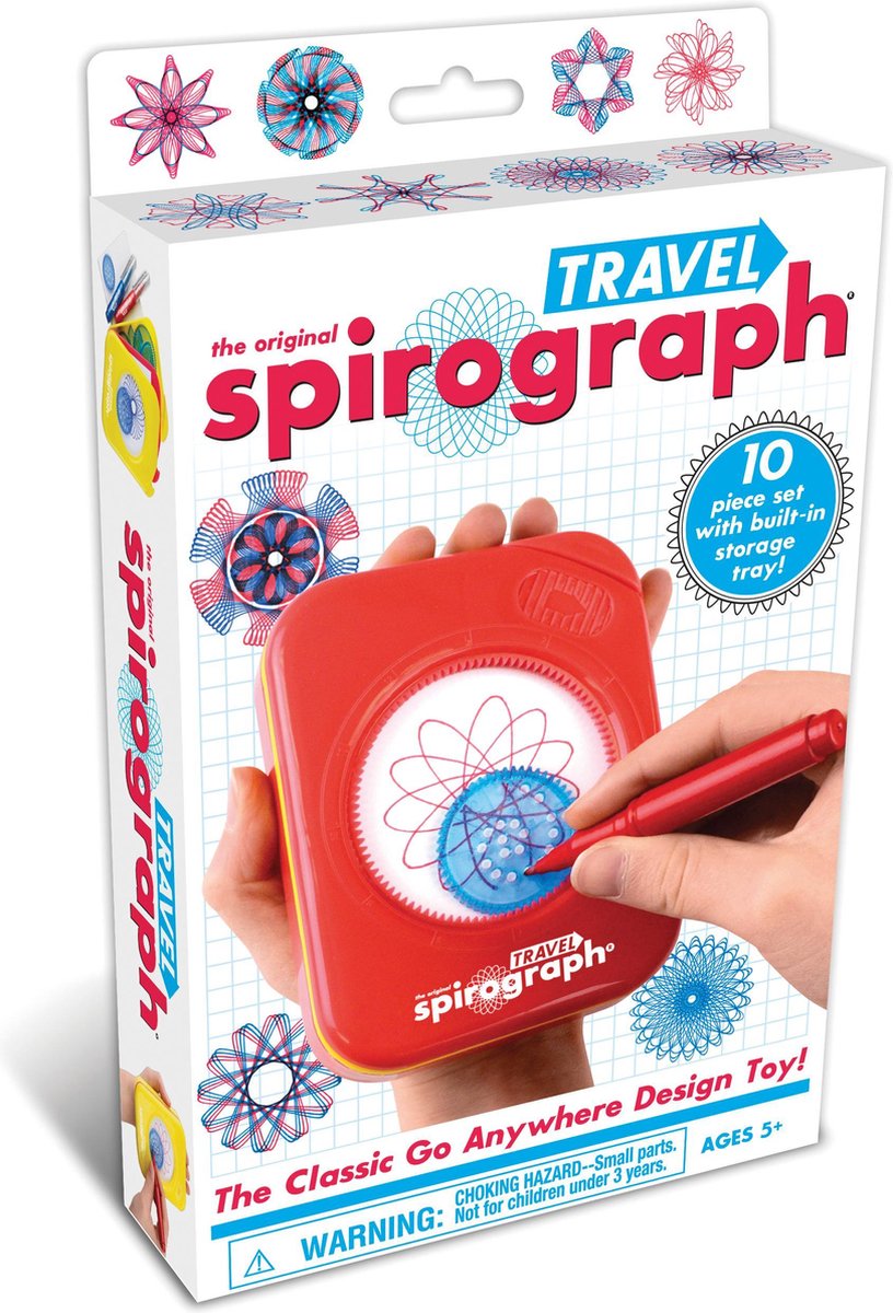 Met Spirograph maak je de mooiste tekeningen met geometrische vormen. Plaats een vorm in de houder, pak je potlood of stift en volg de vormen - er zijn duizenden verschillende creaties mogelijk! Nu kun je ook onderweg talloze prachtige designs maken met de klassieke Travel Spirograph®! Deze draagbare Spirograph®-studio bevat een geïntegreerde designring, een werkoppervlak en een opbergvak voor je schijven, pennen, papier, ontwerpgids en afgewerkte kunstwerken. De Travel Spirograph® is het ideale ontwerpspeelgoed voor onderweg!