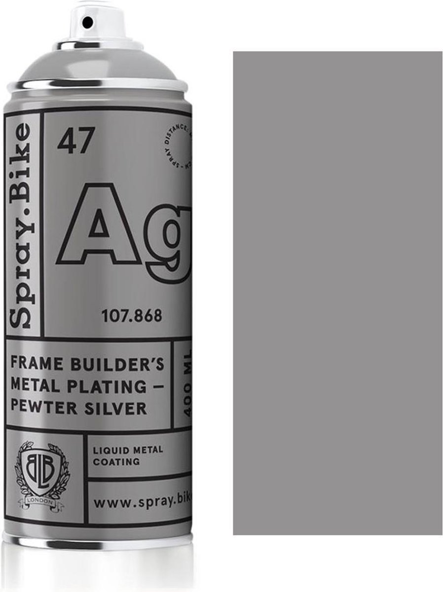 De Spray.Bike Frame Builder’s – Metal Plating Zilver is een hoogwaardige tin / zilverkleurige verf met een hoog metaal (aluminium en zink) gehalte. Nadat deze vloeibare metal paint eenmaal droog is, is het keihard en geeft niet af. De verf kan direct op bestaande lak worden gespoten (natuurlijk wel eerst de ondergrond goed ontvetten). Als het oppervlak onbewerkt is, gebruik dan eerst de juiste Spray.Bike Frame Builder primer. Deze spuitverf is speciaal ontwikkeld voor fietsframes en heeft een licht satijnen afwerking. Het is aan te raden de Spray.Bike Frame Builder Transparant Finish ter afwerking te gebruiken, om te beschermen tegen weersinvloeden. – Kleur van het product: tin / zilver – Spuitafstand: minimaal 20 cm – Hoog gehalte aan echte metalen – Aanbevolen minimale laag: één – Inhoud: 400ml (goed voor +- 2 vierkante meter) – Droogtijd: 2 uur + – Vanwege het hoge metaalgehalte, raden we ten zeerste aan om een mond- en neusmasker te gebruiken bij gebruik van
