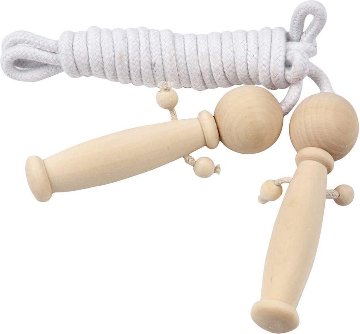 Sterk springtouw met houten handvaten in popvorm.Sterk springtouw met houten handvaten in popvorm.