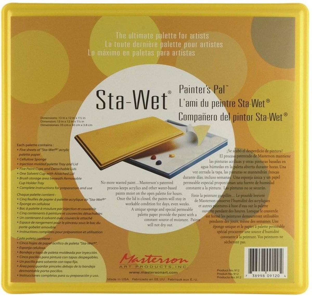 Masterson Art Sta-Wet Painter's Pal (13 "x12"). Het ultieme palet voor miniatuurschilders. Geen verspilde verf meer. . . Masterson's gepatenteerde proces houdt acryl en andere verf op waterbasis urenlang vochtig op het open palet. Als het deksel gesloten is, blijft de verf dagen, zelfs weken in werkbare staat. Een unieke spons en speciaal doorlatend paletpapier biedt de verf een constante bron van vocht. Verven drogen niet uit. Afmetingen: 13 "x 12" x 1,5 ", Paletformaat: 9 "x 12", Elk palet bevat: Vijf vellen "Sta-Wet" acryl paletpapier, Cellulosespons, Spuitgegoten palet Lade en deksel, Vijf verfbekers en afneembare deksels, Eén oplosmiddelbeker met bevestigde deksel, Penseelopslagruimte onder de verwijderbare bekerhouder lade, Volledige instructies voor voorbereiding en gebruik, Extra papier en sponzen zijn goedkoop en beschikbaar.