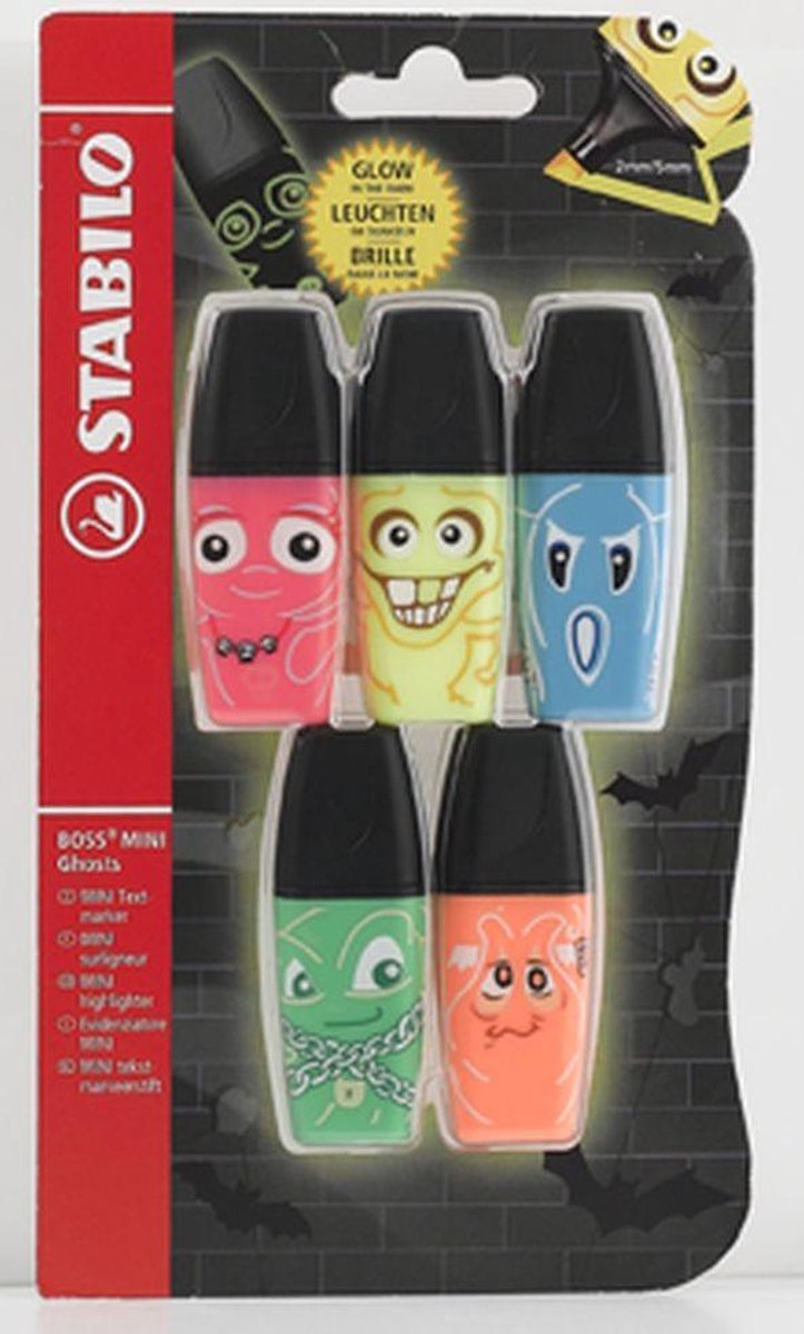 Stabilo Boss Mini Heroes. De klassieke Stabilo Boss Original in mini formaat met 5 super helden. Karakters met ´Glow in the dark´ effect: lichten op in het donker! 5 fluorescerende kleuren. 2 schrijfbreedtes in één punt, 2 + 5 mm. Inkt op waterbasis. Limited edition - tijdelijk verkrijgbaar. STABILO Anti-Dry-Out technologie: kan 4 uur zonder dop zonder uit te drogen. Ideaal voor geconcentreerd werken. Coole karakters om te verzamelen en te ruilen.